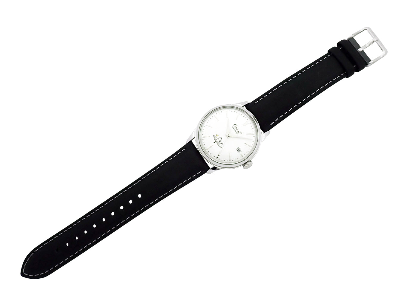 SS。白系文字盤。自動巻。ケース径38.4mm・腕周り20.5cm。純正革・純正尾錠。箱・保証書(オリエント公式ストア 日付無)付。