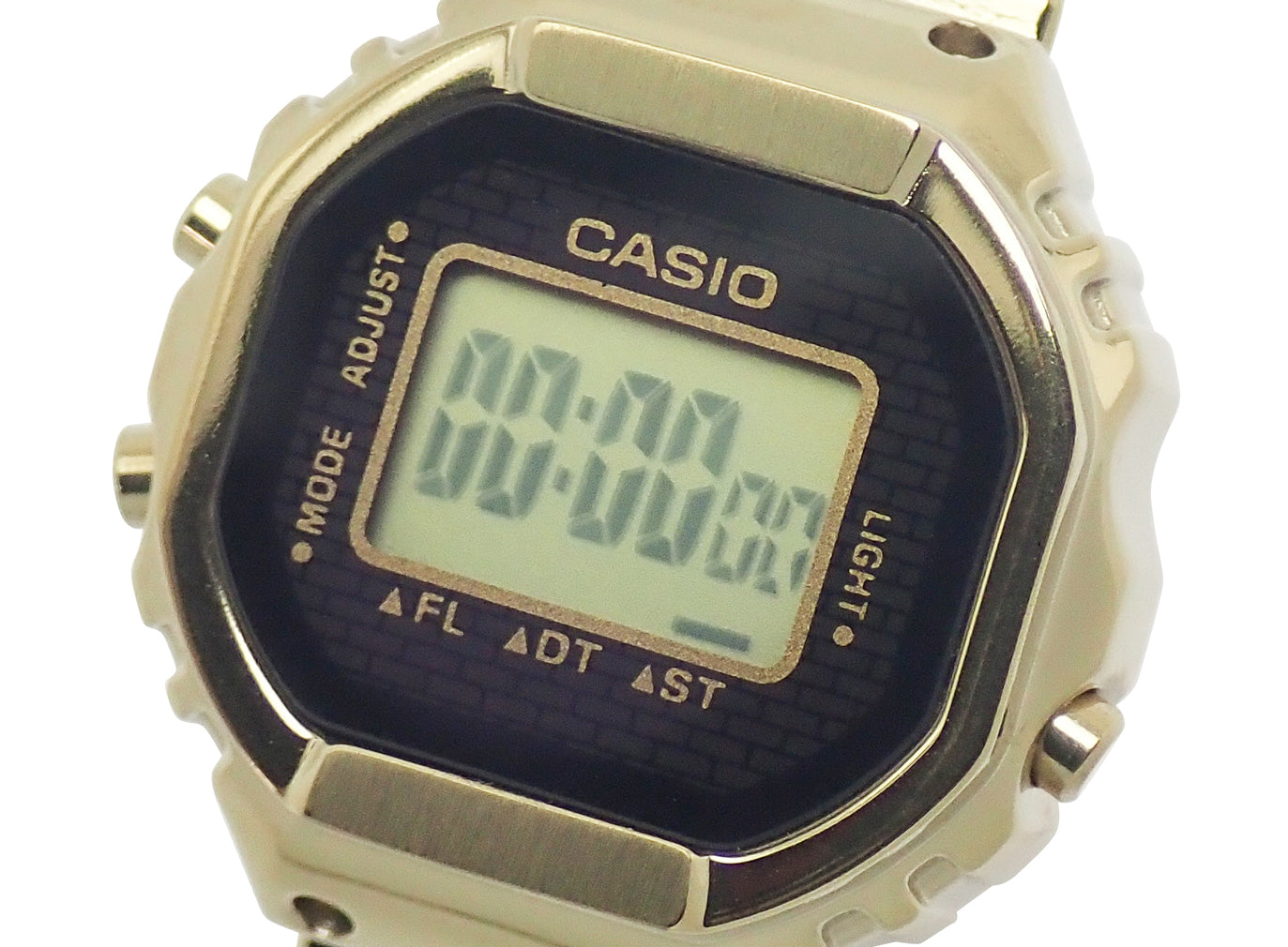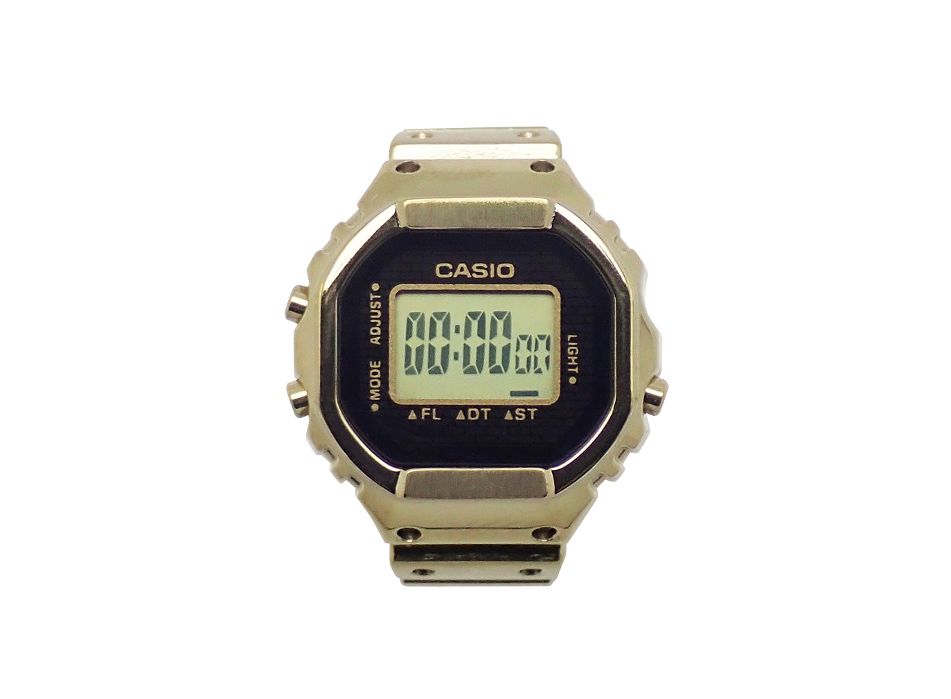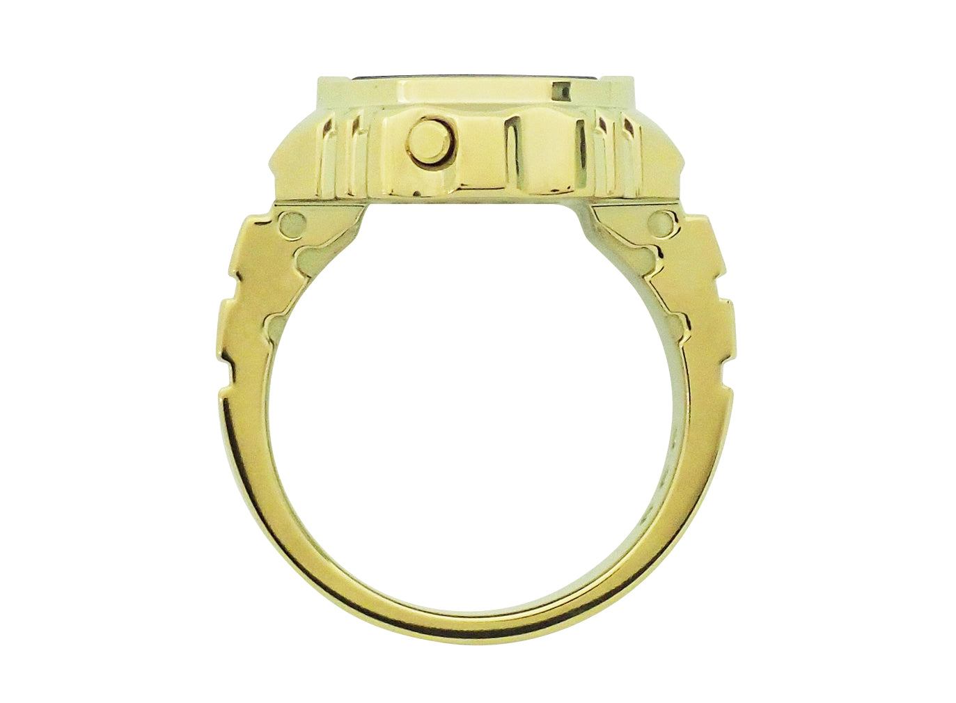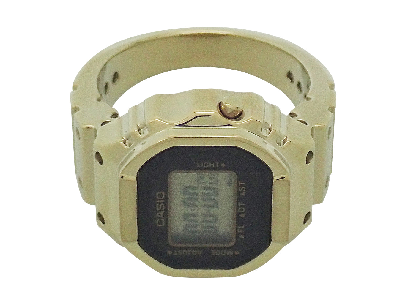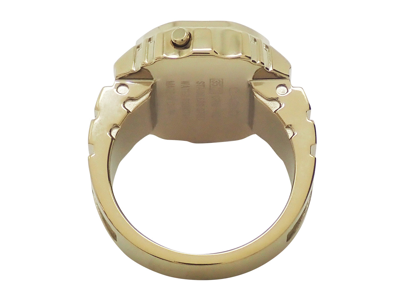 カシオの腕時計の機能と複雑な造形を指輪サイズで再現したモデルです。ステンレススチール製のリングを高度な金属射出成形技術でディテールまで形づくり、ゴールドカラーのイオンプレーティングを施しました。一般的な腕時計用モジュールに比べ約1/10にダウンサイジング。小型ボタン電池と組み合わせることで、デジタルウオッチを指輪サイズで実現しました。さらに7セグメント表示の液晶も装備。時刻以外に日付、デュアルタイム、ストップウオッチなども表示します。リングサイズは22号で、19号用(内径19mm)と16号用(内径18mm)のサイズ調整用スペーサーが付属しています。