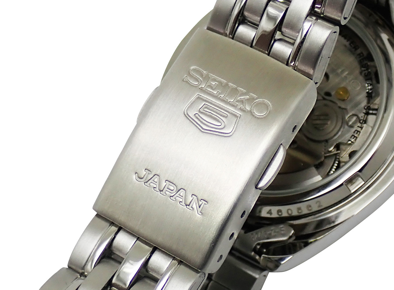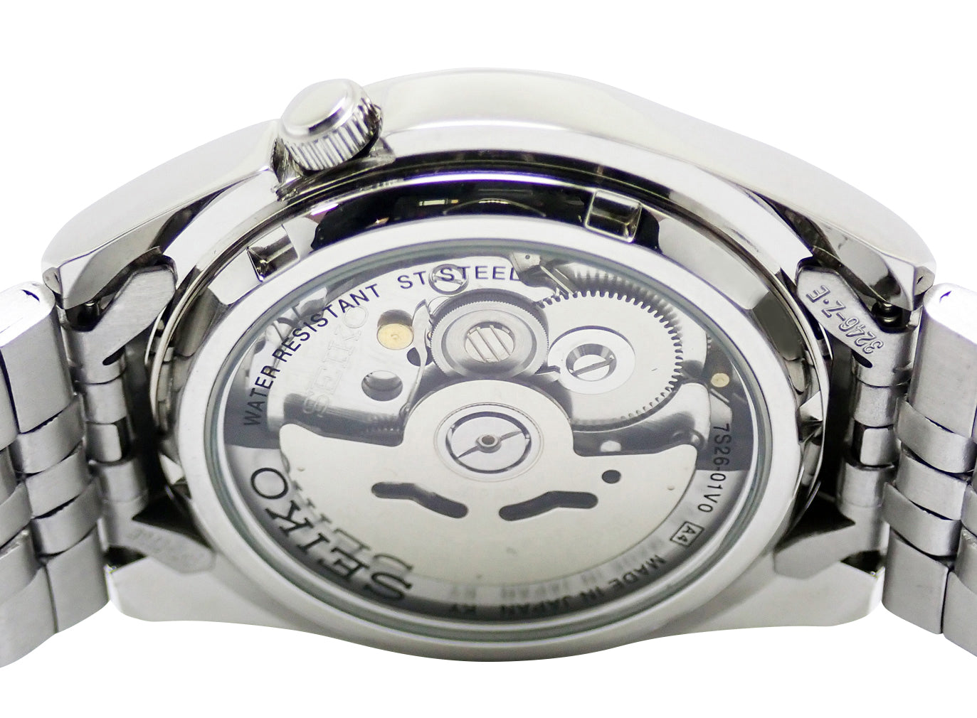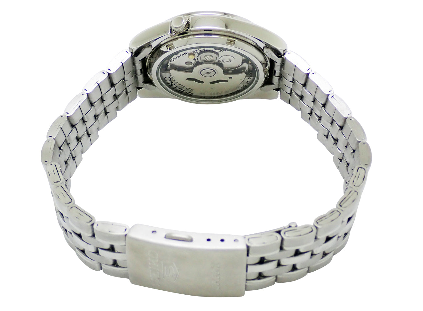 セイコーの世界的ロングセラーアイテム「SEIKO5」。カレンダー表記(英語/アラビア語語)。海外モデル。Cal.7S26搭載。シースルーバックからキャリバーの確認が出来ます。