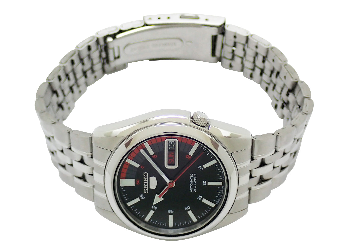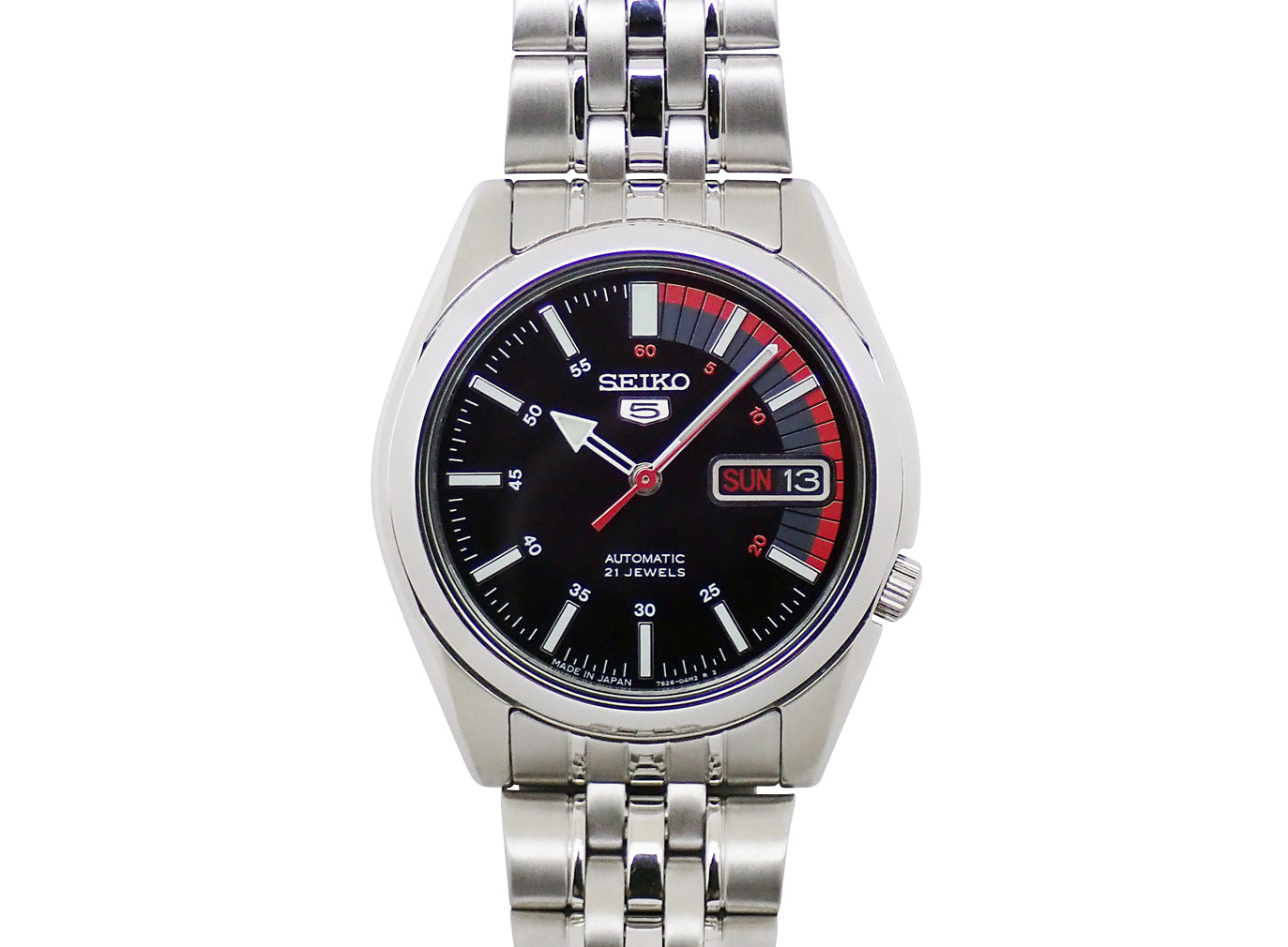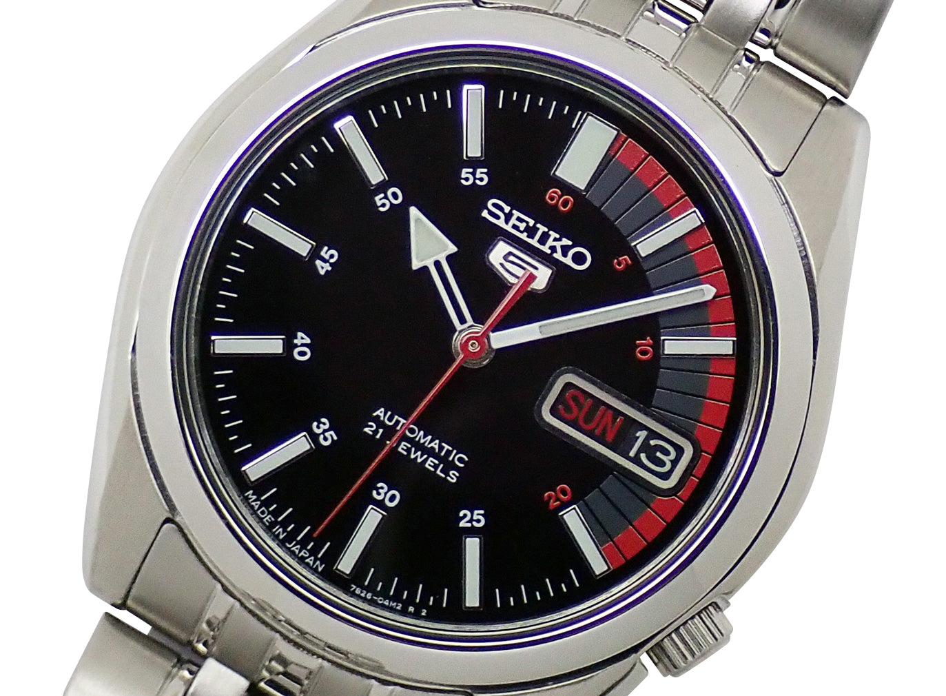 セイコーの世界的ロングセラーアイテム「SEIKO5」。カレンダー表記(英語/アラビア語語)。海外モデル。Cal.7S26搭載。シースルーバックからキャリバーの確認が出来ます。