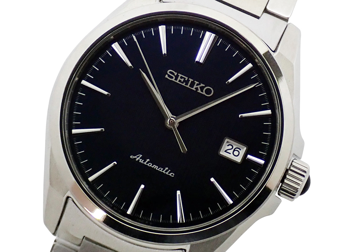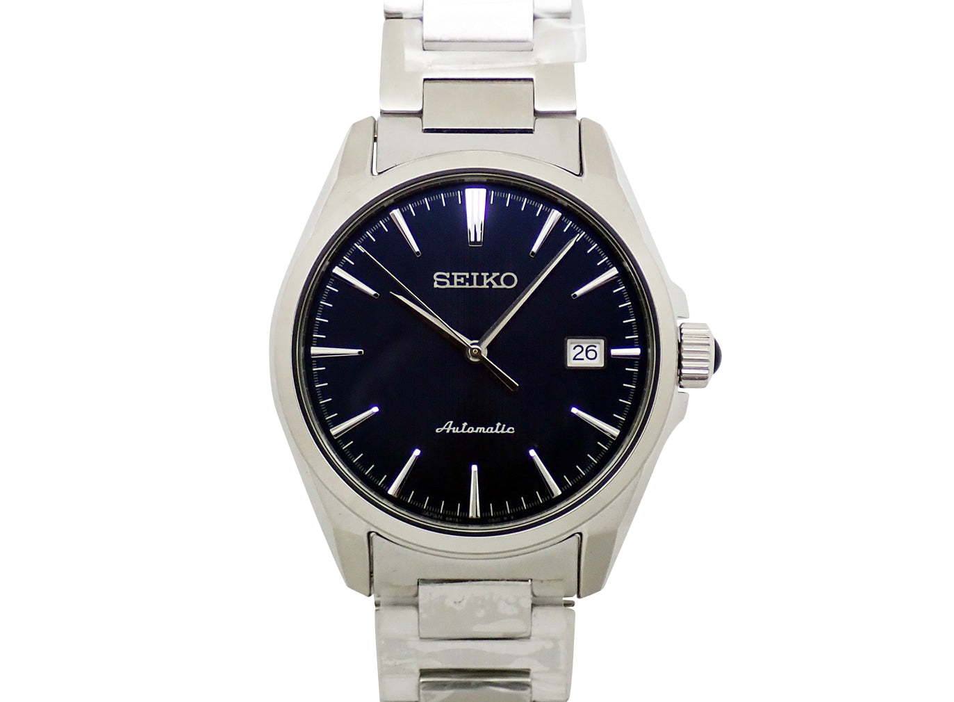 SS。ネイビー文字盤。自動巻。ケース径39.5mm・腕周り20cm。税込定価¥77,000。箱付。
