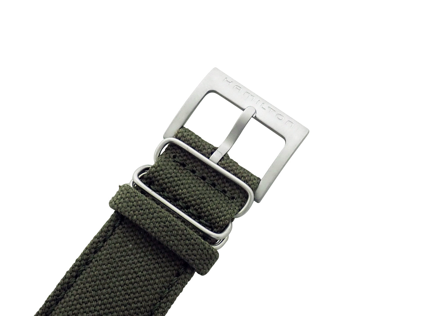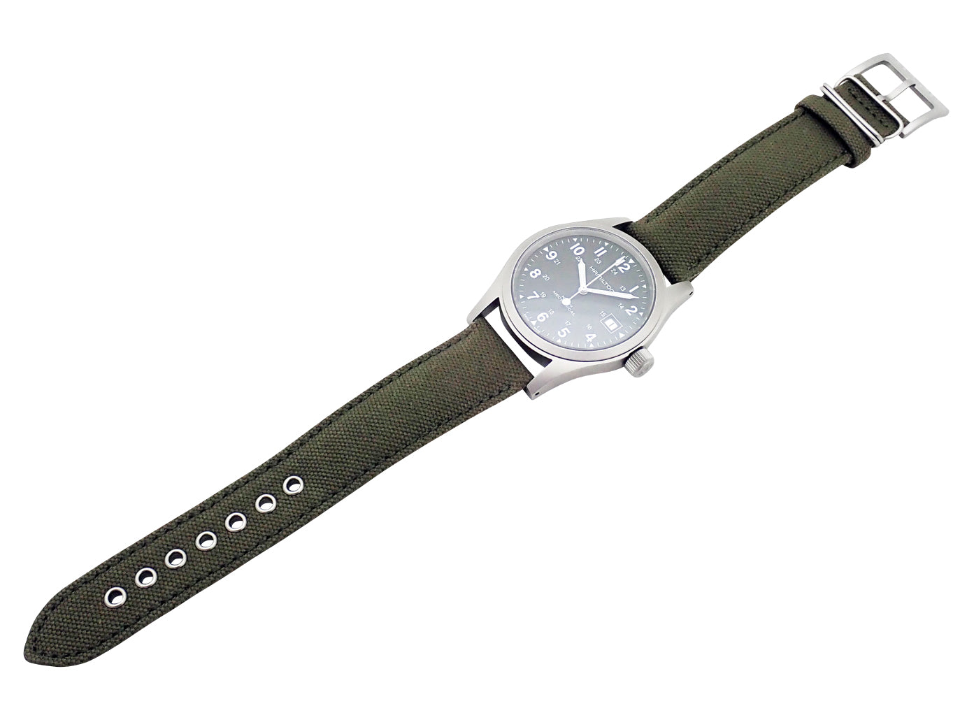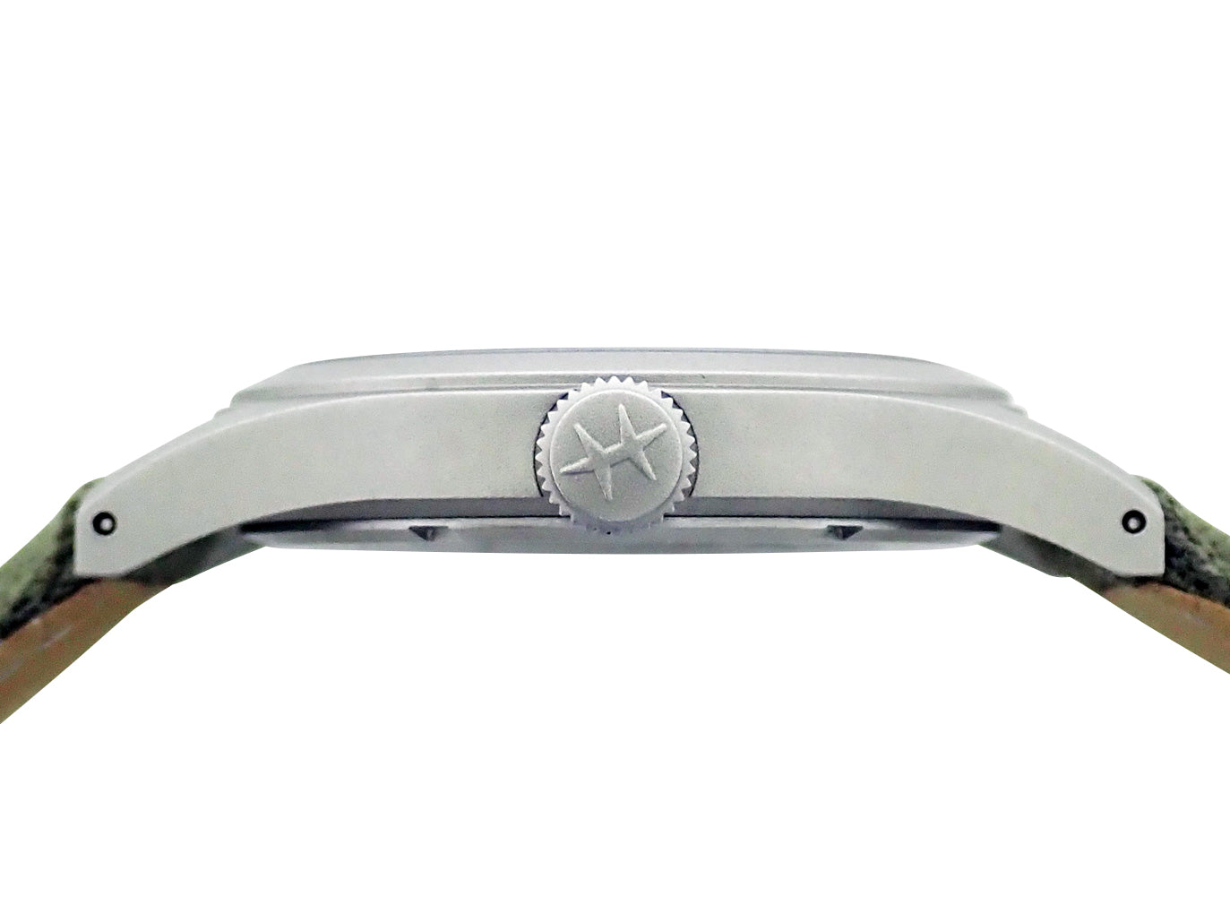 SS。カーキ文字盤。手巻。ケース径38mm・腕周り20.5cm。税込定価¥89,100。純正ベルト・純正尾錠。箱・保証書(販売店のみ)・純正ブレス付。