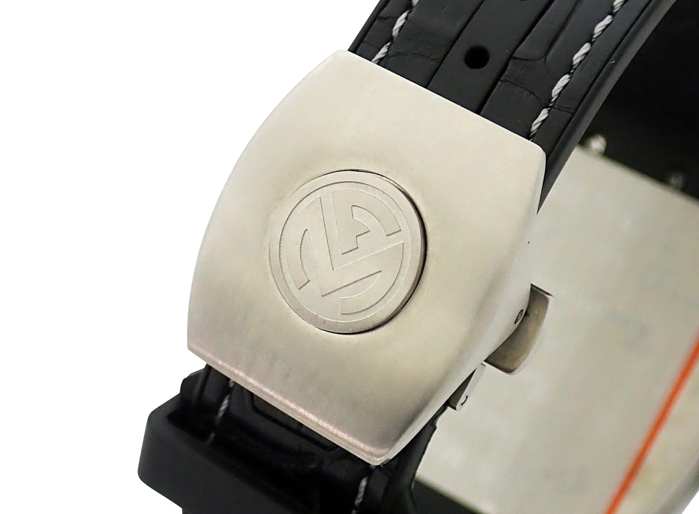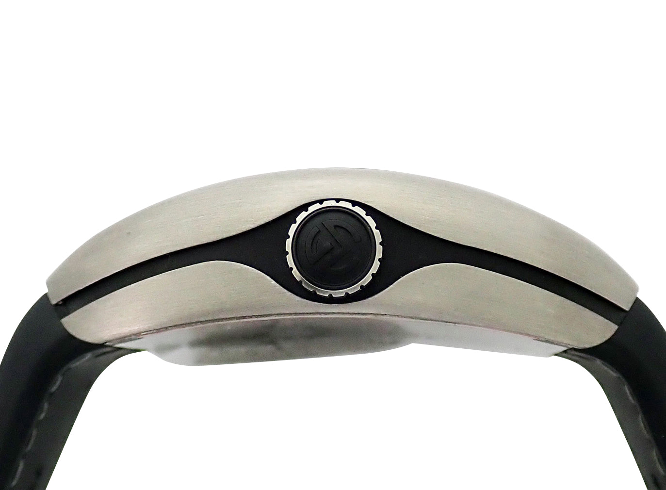 チタン。黒文字盤。自動巻。ケース縦53.7×横44mm・腕周り19cm。純正ラバー・純正Dバックル。箱・保証書(未記入)付。OH済。