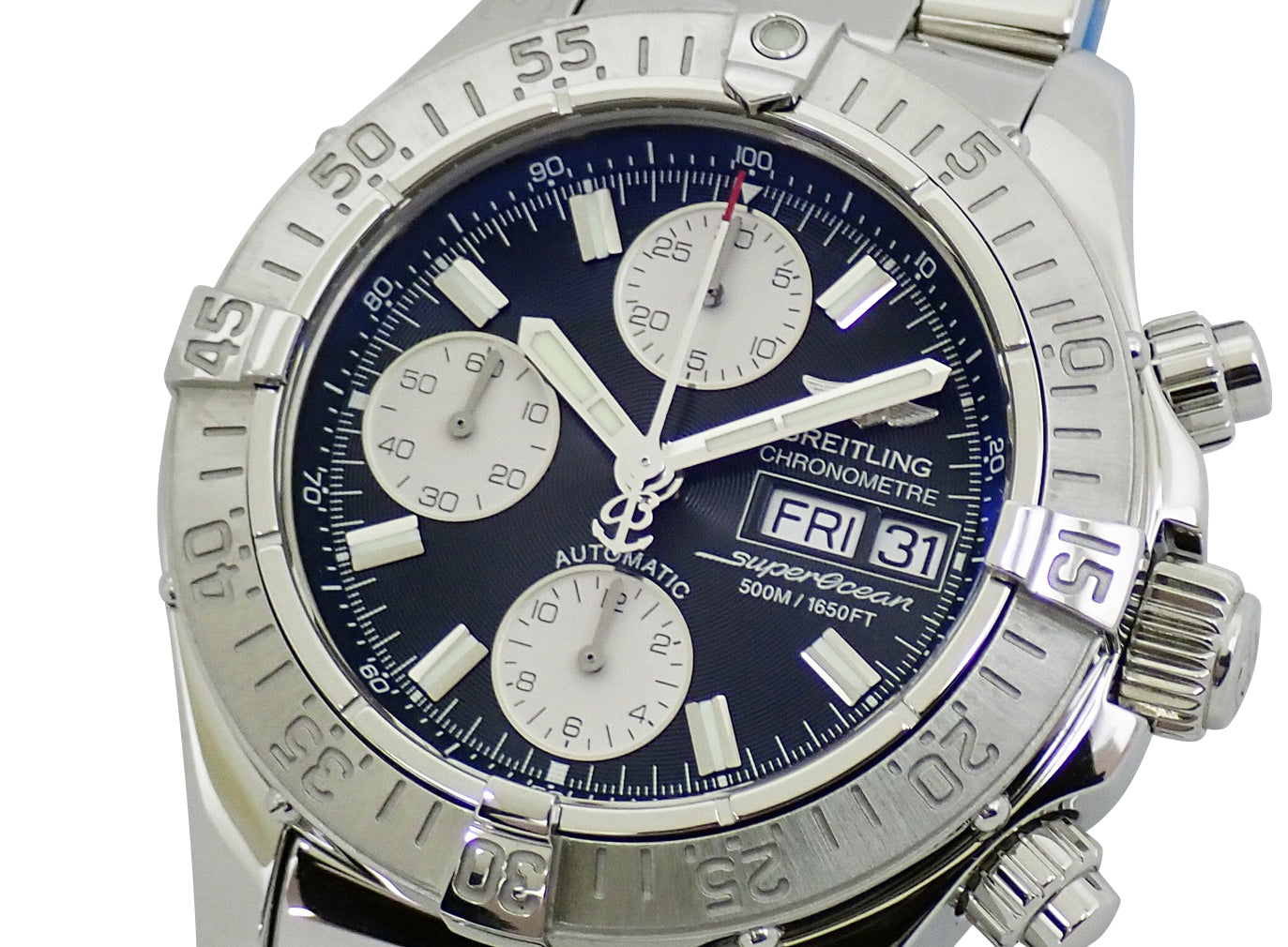 ブライトリングを代表する現代的なスタイルのダイバーズウォッチコレクション「スーパーオーシャン」。500mの防水性能にデイ・デイト表示とクロノグラフ機能も搭載した機能的なモデルです。