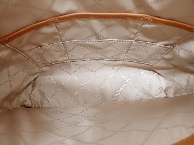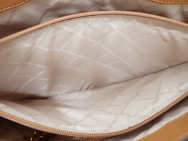 マイケル・コースのボイジャーコレクションは、旅行やビジネスにも使える機能的でスタイリッシュなバッグを提供するラインです。ブラウンのコーテッドキャンバスにブランドロゴをあしらっています。中央にジップ式の仕切りがあります。持ち手やショルダーは調節可能で、外側にはオープンポケットが2つ、内側にはジッパーポケットとドロップポケットが各1つ付いています。