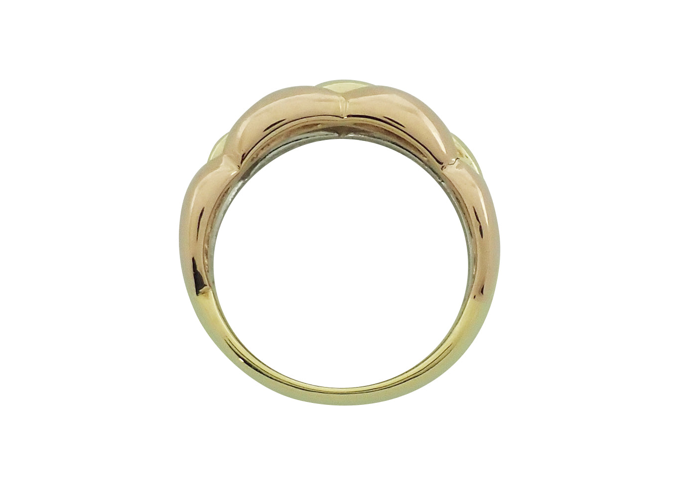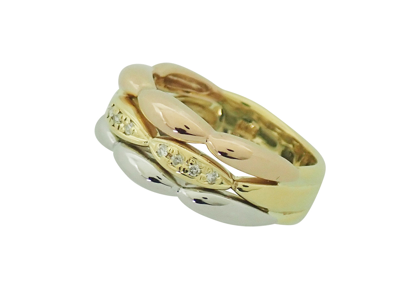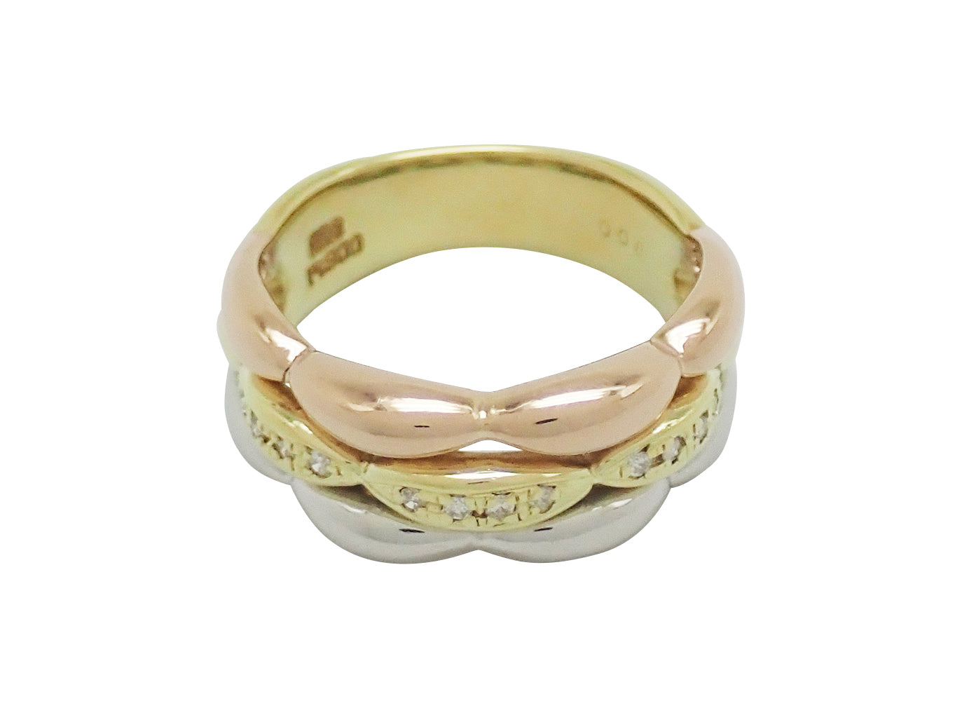 イエローゴールド、ピンクゴールド、プラチナの3色を組み合わせた洗練されたスリーカラーリング。それぞれの色が調和し、上品な輝きを放ちます。どんなスタイルにも合わせやすく、日常使いから特別な場面まで幅広く活躍。素材の質感を活かしたデザインは、時間とともに味わい深くなる逸品です。