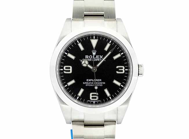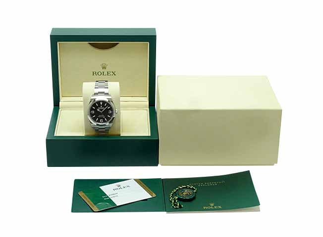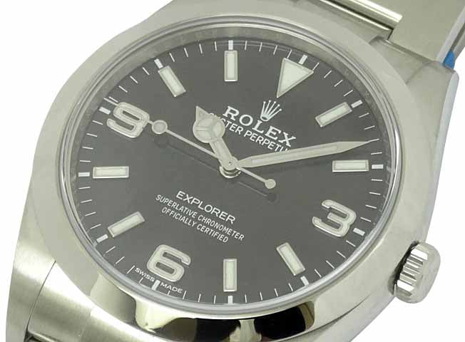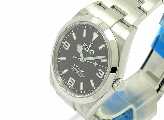 ロレックス エクスプローラーI 214270 中古。SS。黒文字盤。自動巻。ケース径39mm・腕周り19cm。鏡面バックル。ランダム・箱・保証書(国内正規品 2016/12/17)付。