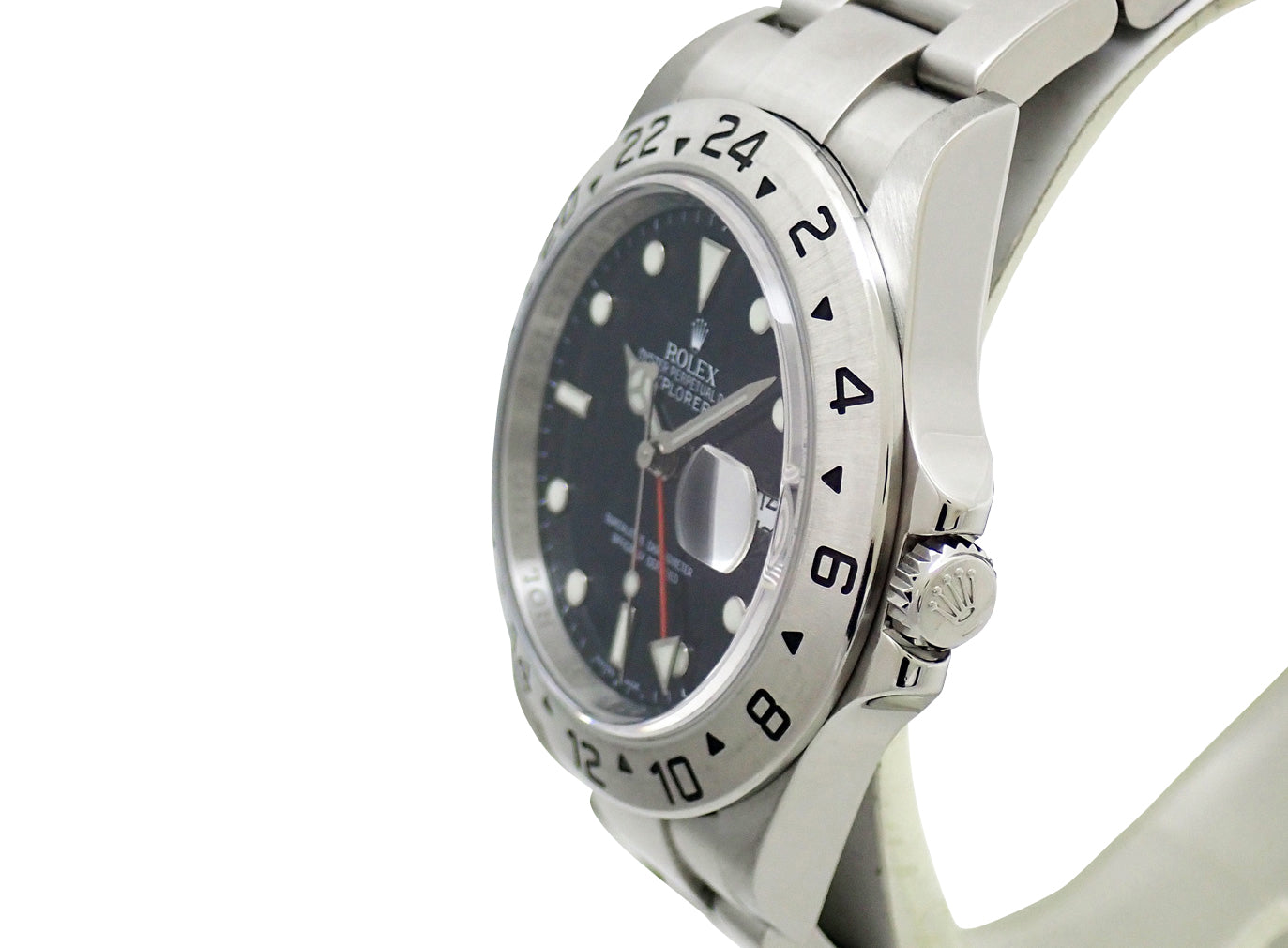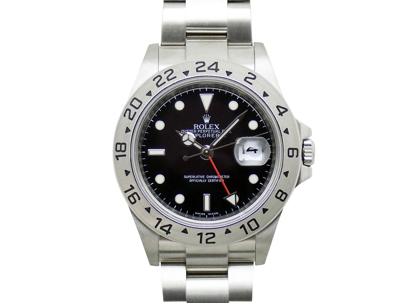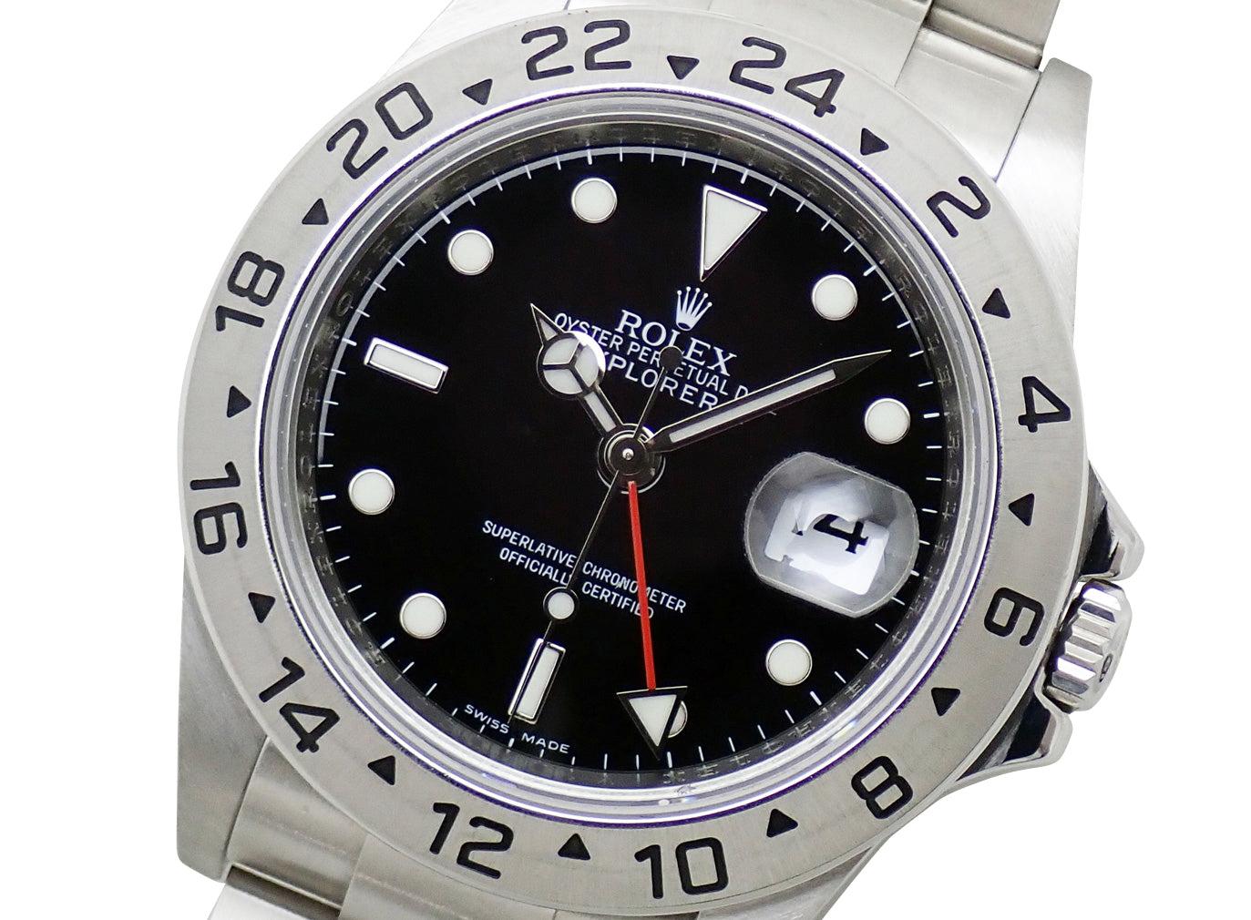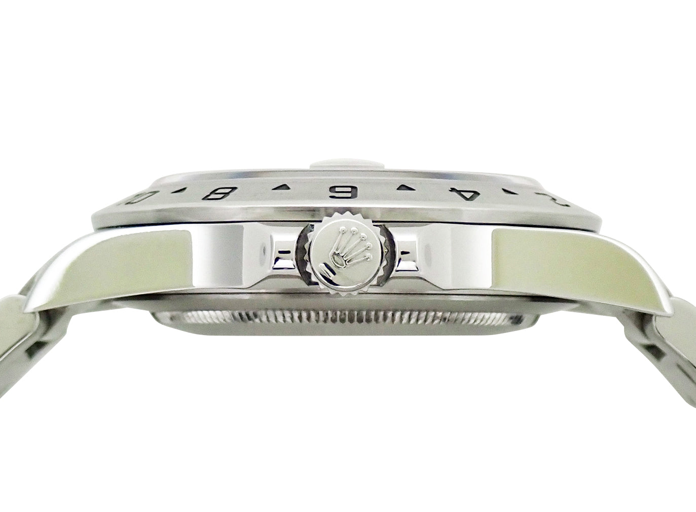 エクスプローラー2は日付表示、24時間針、24時間ベゼル、リューズガードなどを備え、エクスプローラー1からグレードアップしました。短針が単独で操作可能なGMT機能は操作もし易く機能的です。V番・ルーレット刻印あり。