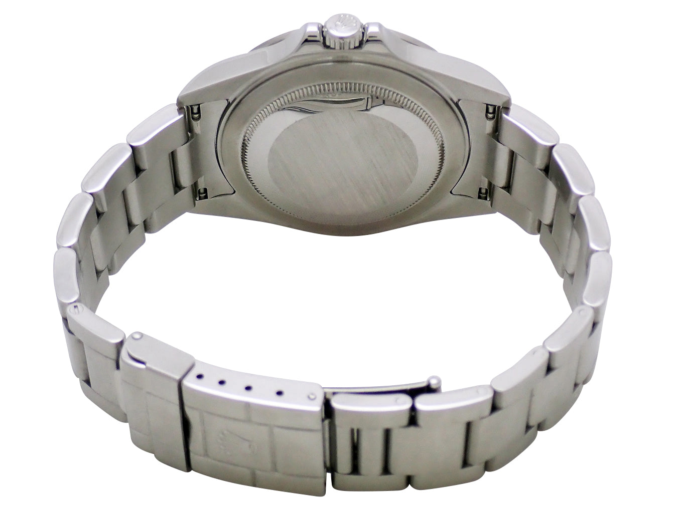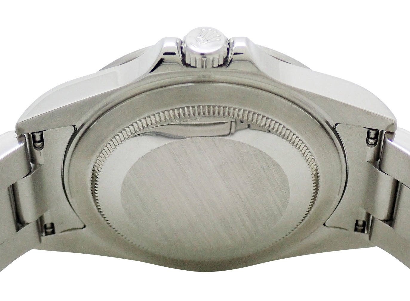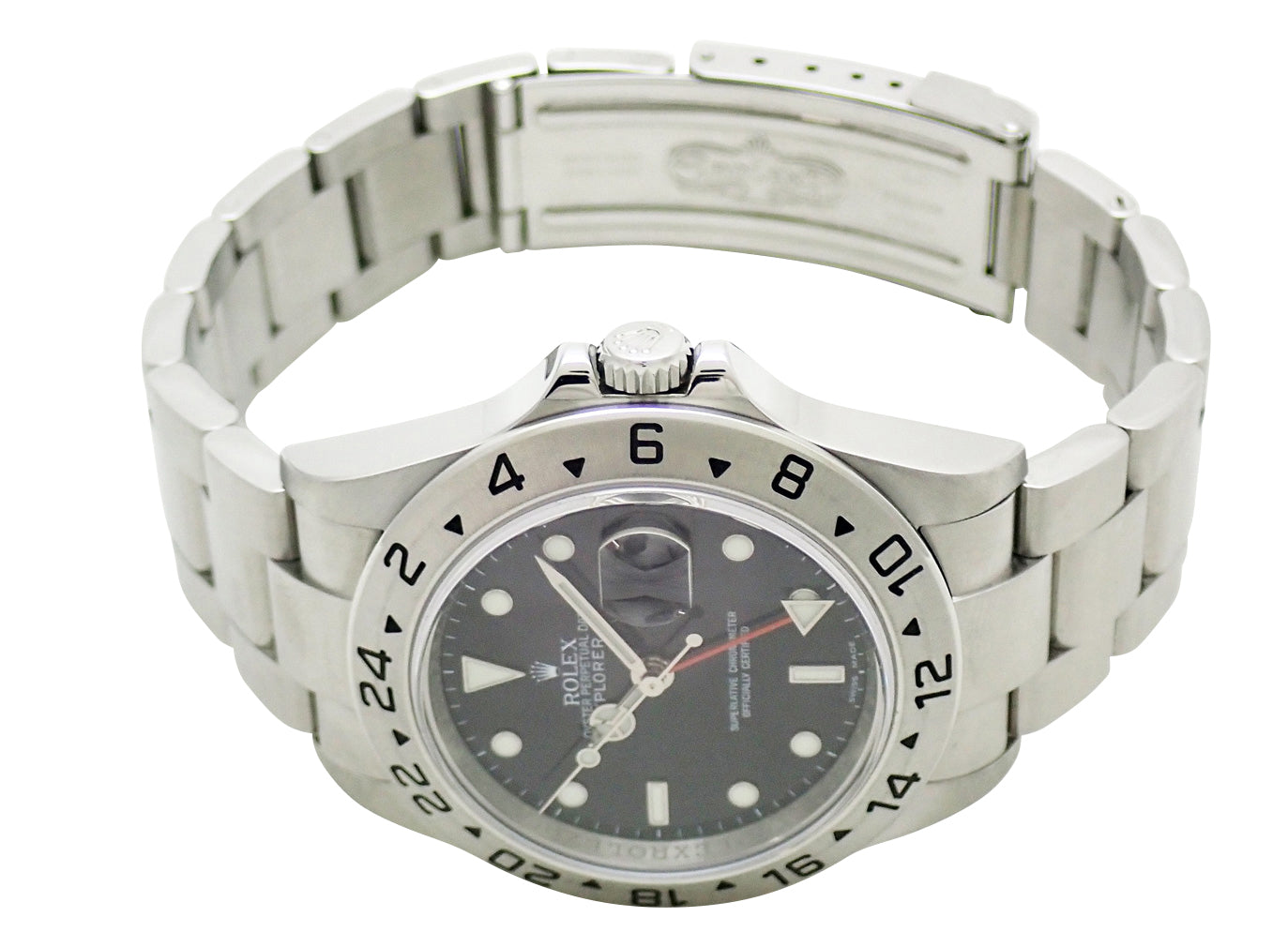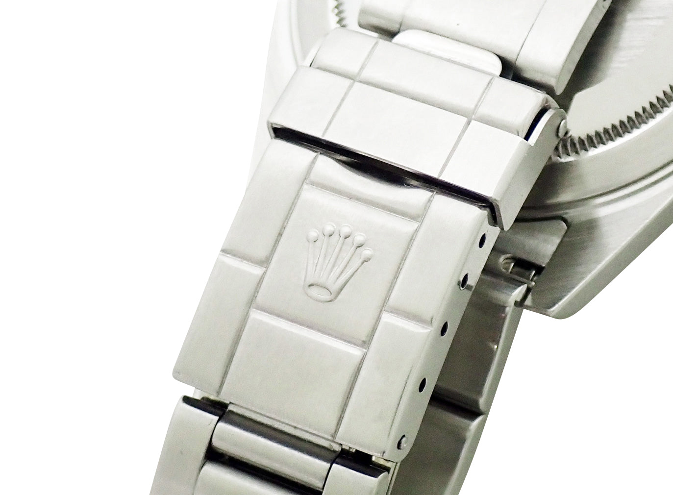 エクスプローラー2は日付表示、24時間針、24時間ベゼル、リューズガードなどを備え、エクスプローラー1からグレードアップしました。短針が単独で操作可能なGMT機能は操作もし易く機能的です。V番・ルーレット刻印あり。