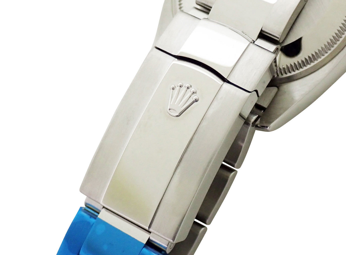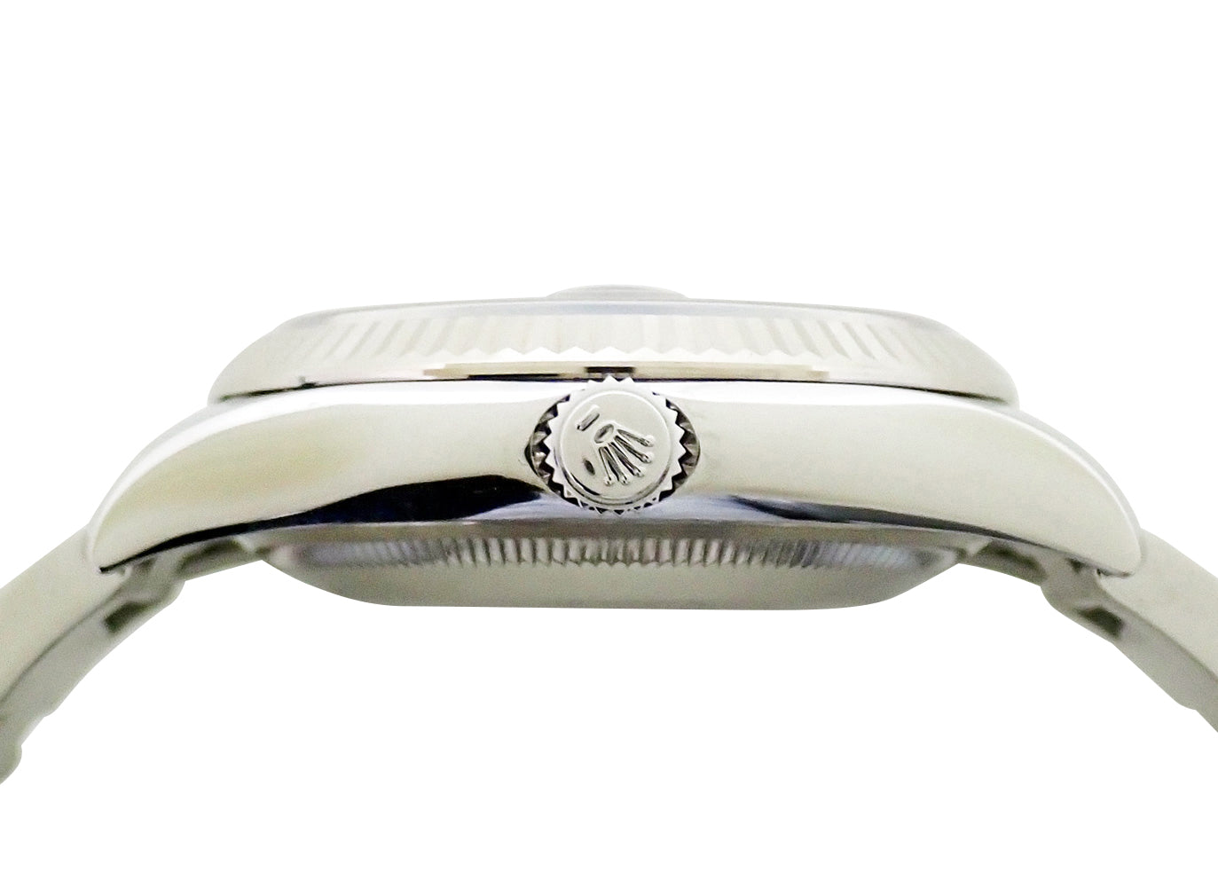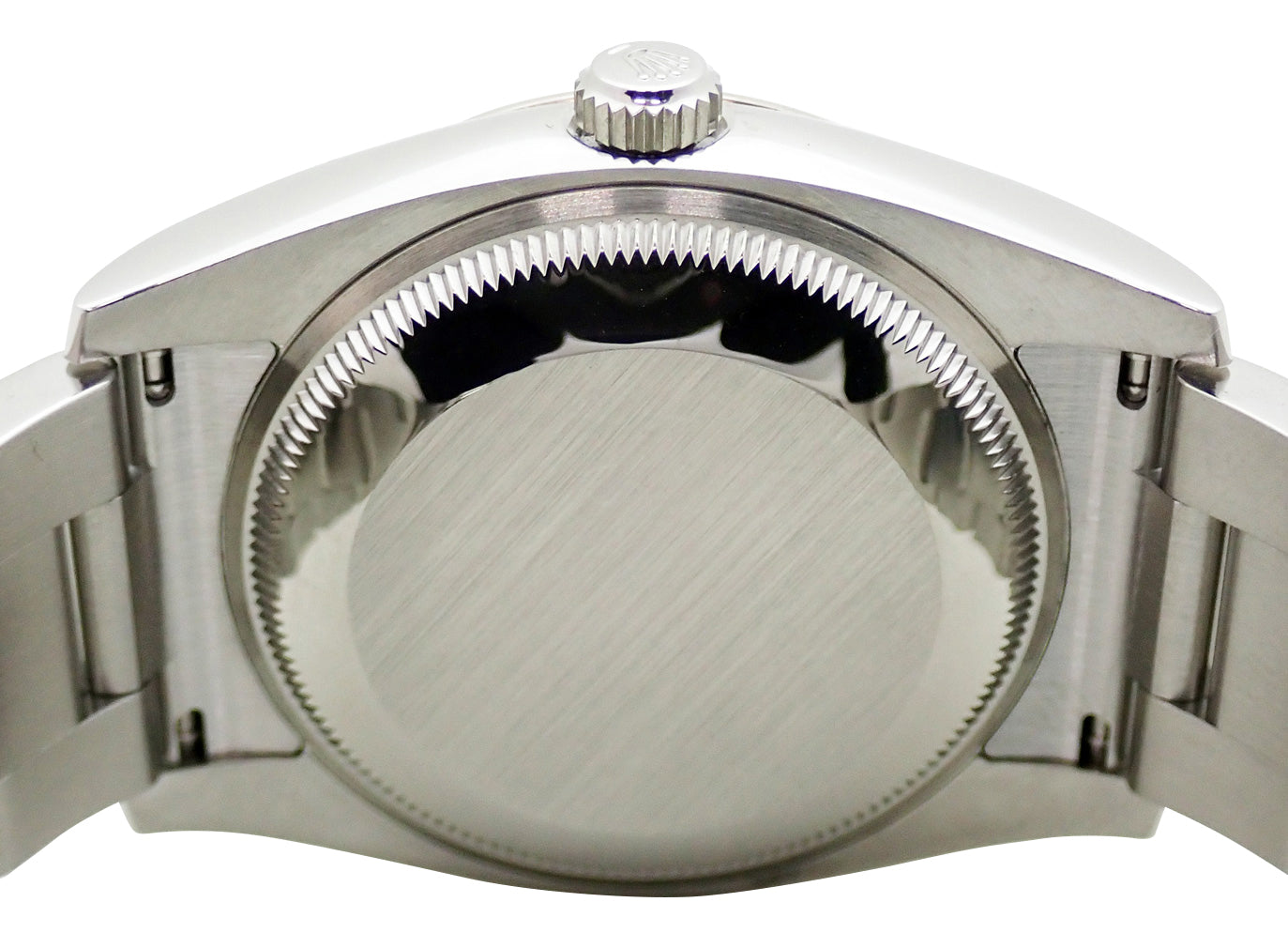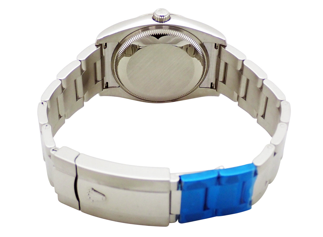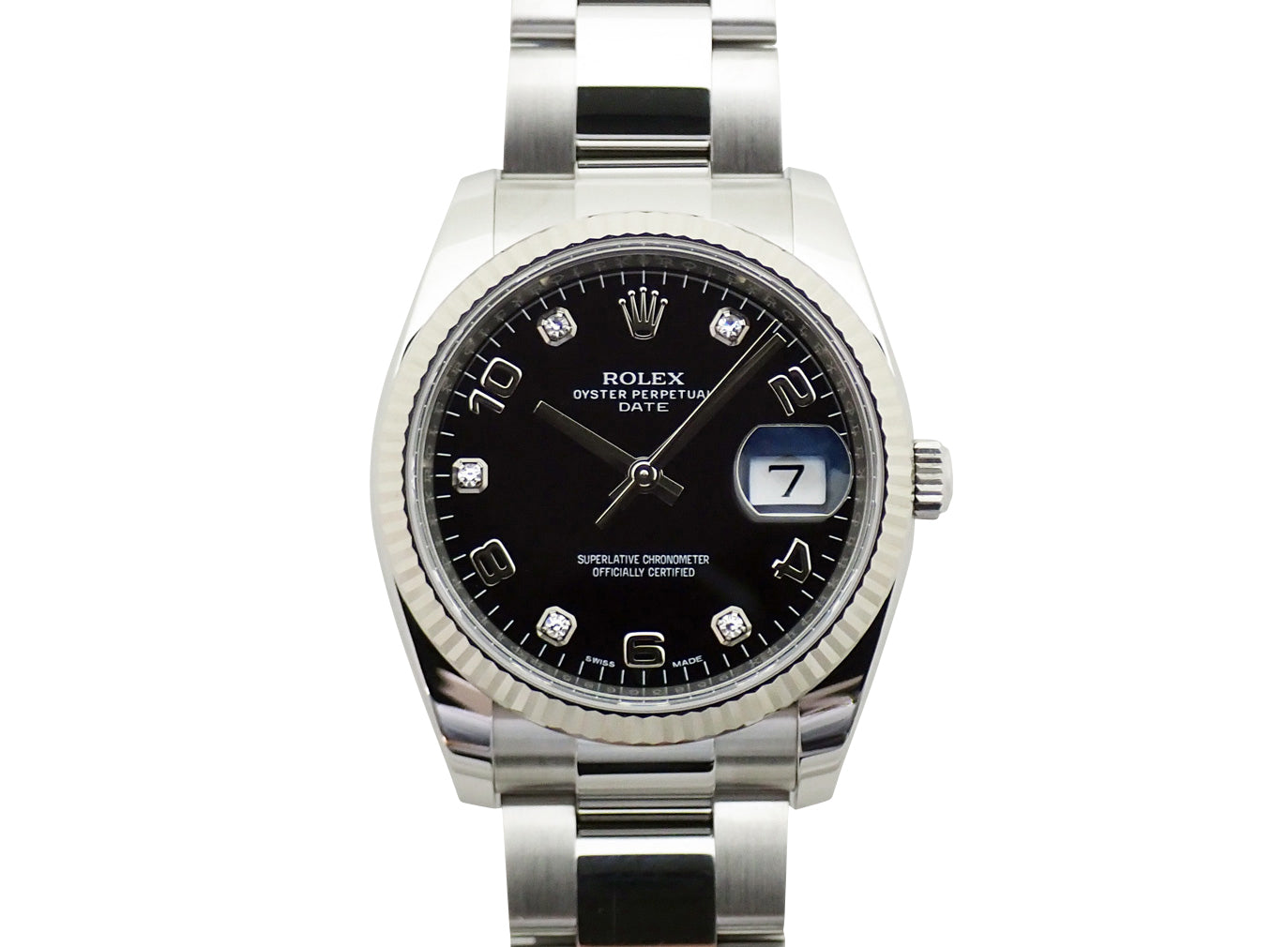 34mmのケースサイズは男女問わず人気のオイスターパーペチュアルデイト。ベーシックなデザインはカジュアルからビジネスまで幅広く活躍します。WG素材のフルーテッドベゼルがラグジュアリー感を演出しています。流通量の少ないWGベゼルモデルです。ランダム・5Pダイヤに黒アラビア文字盤モデル。