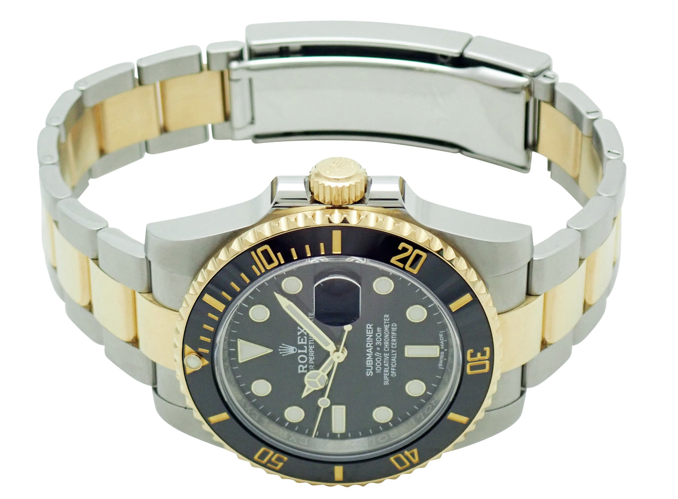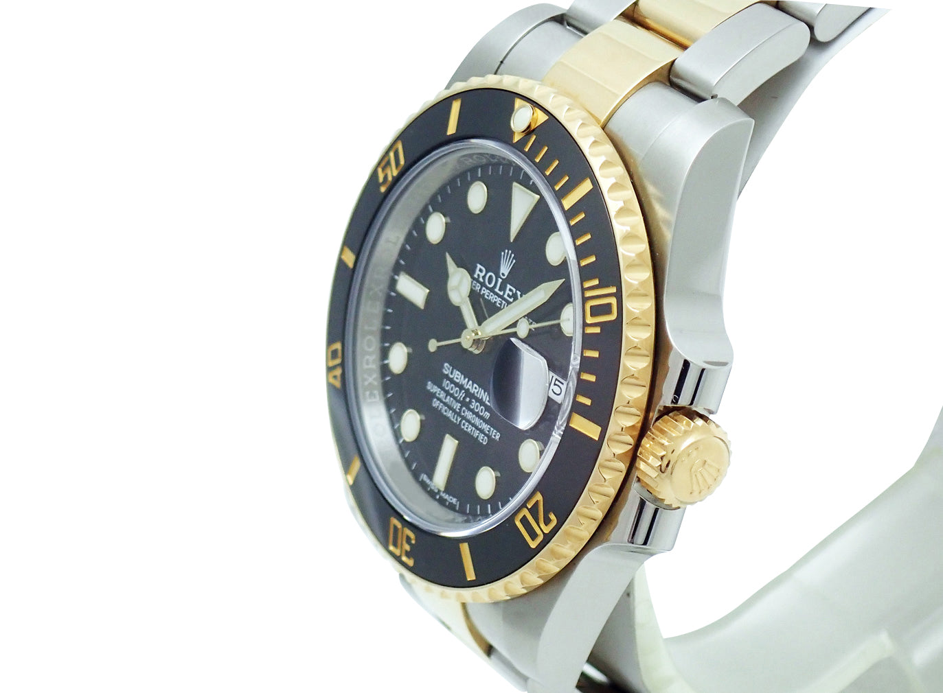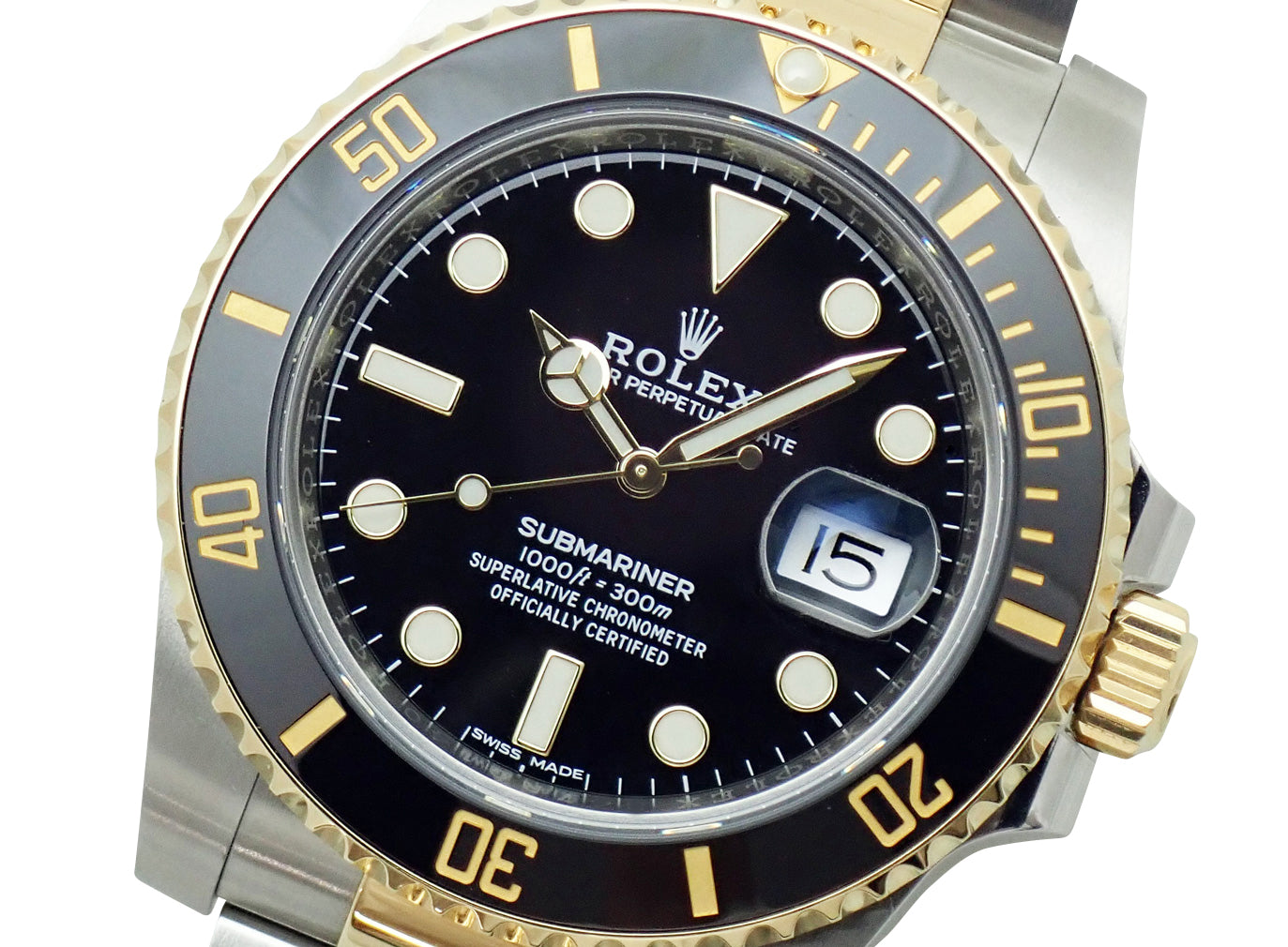 ロレックスのスポーツモデルの中でも絶大の人気を誇るサブマリーナのSS/YGコンビモデル。16613から116613へのモデルチェンジによってそのベゼルがセラミック素材に変わり、素材独特の光沢がモダンな雰囲気を醸し出しています。