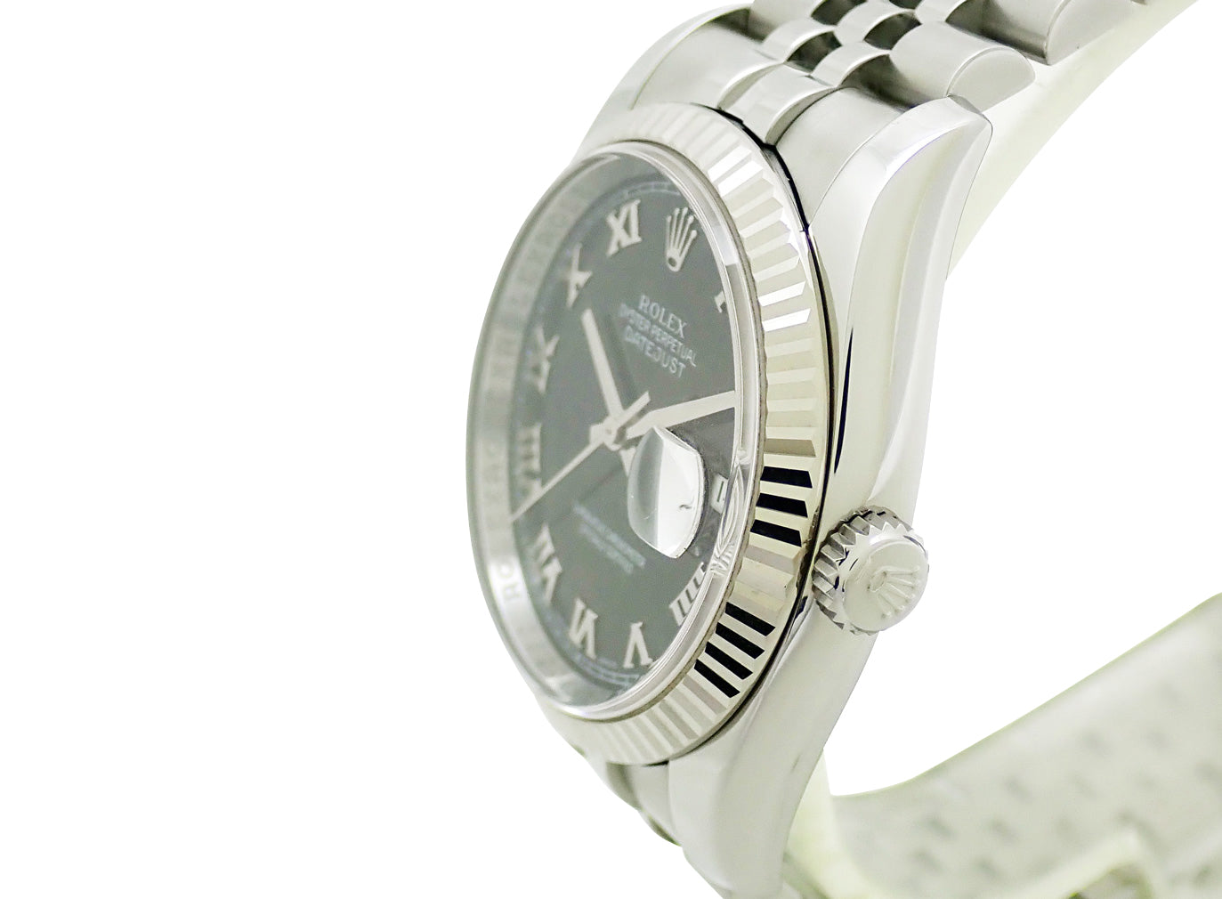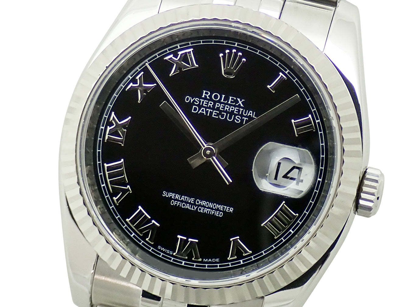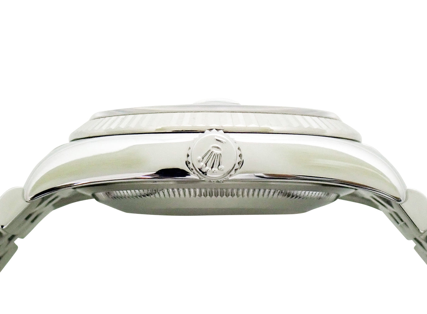 24時に日付が瞬時に変わる「デイトジャスト」機構を搭載したロレックスを代表するモデル。フルーテッドベゼルはWG素材、ラグジュアリーな演出をしてくれます。人気の黒ローマ文字盤。