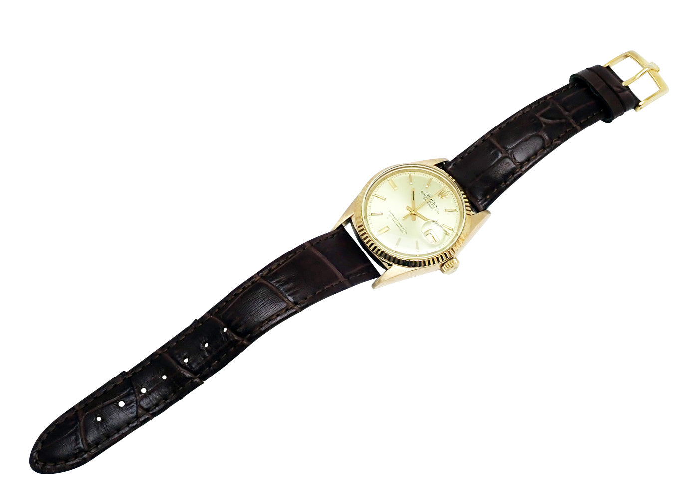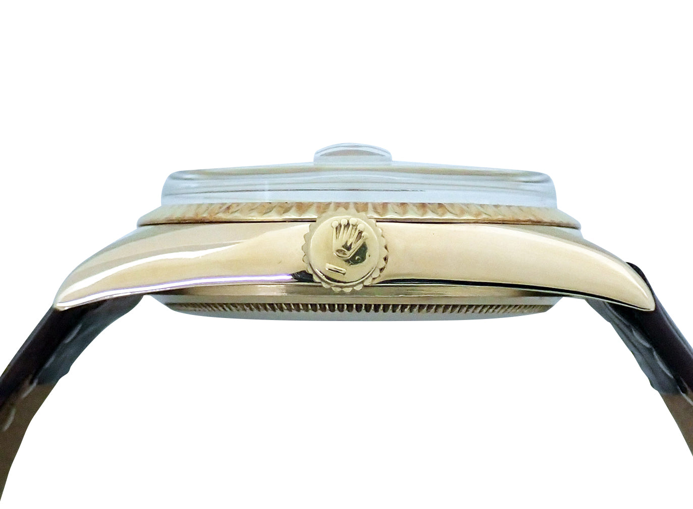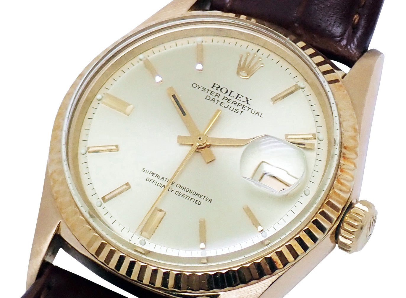 ロレックスのドレスウォッチの王道、デイトジャストモデルです。程よいサイズにベーシックなデザインは幅広く活躍するモデル。「1601/8」はイエローゴールド製のラグジュアリーなモデル。