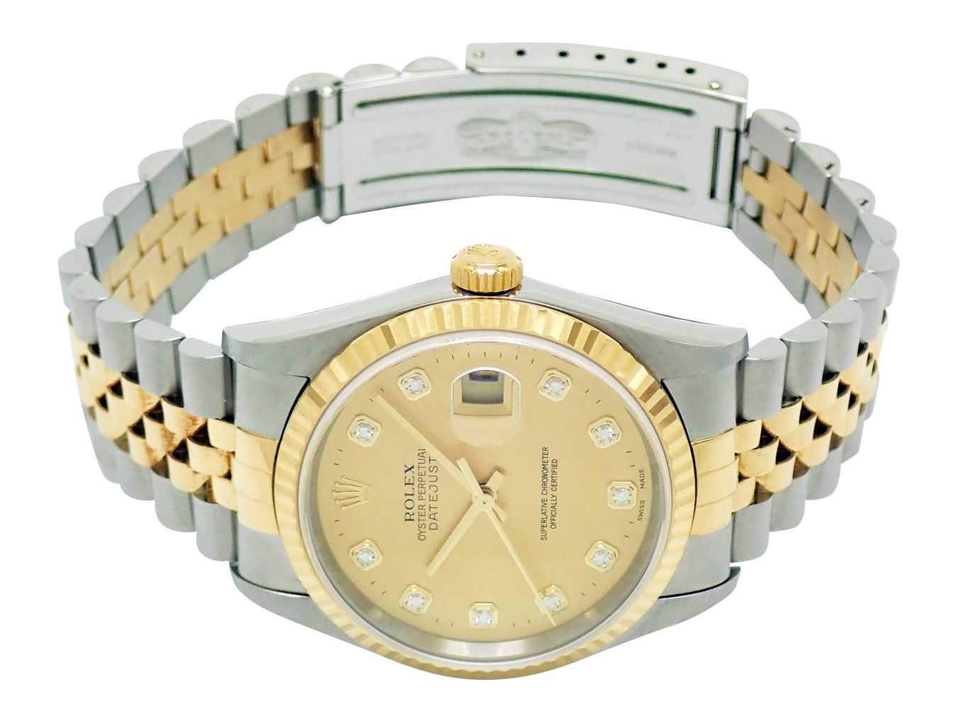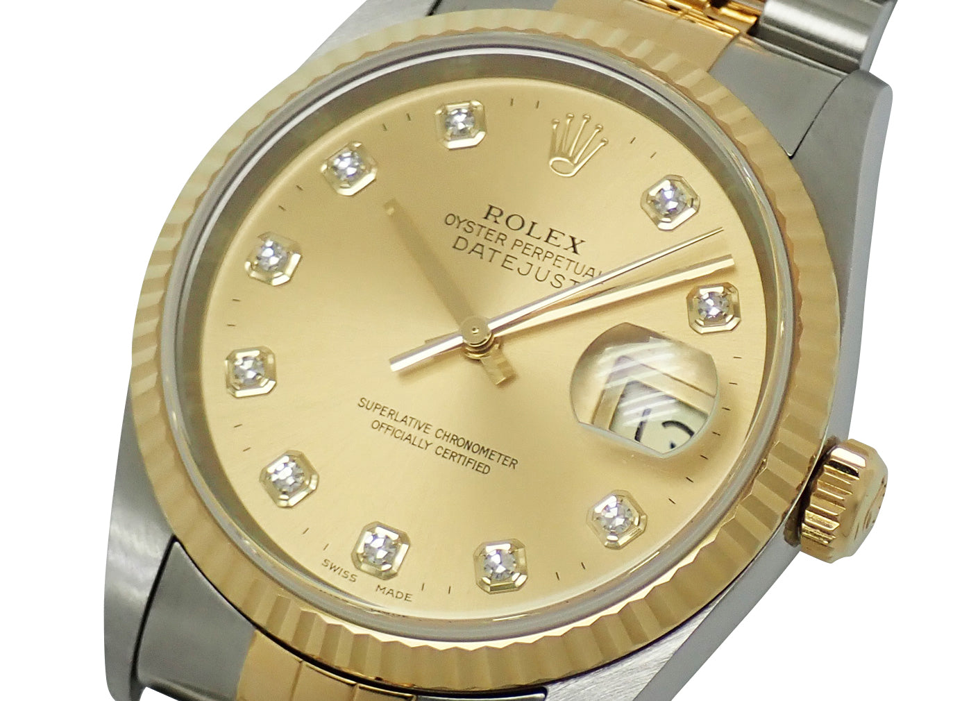 ロレックスを代表するデイトジャスト。高級感のあるフルーテッドベゼルにジュビリーブレスを装備。自動巻Cal.3135搭載。定番の飽きの来ないデザインは末永くお使い頂けます。10Pダイヤ文字盤がラグジュアリーな演出をしてくれます。