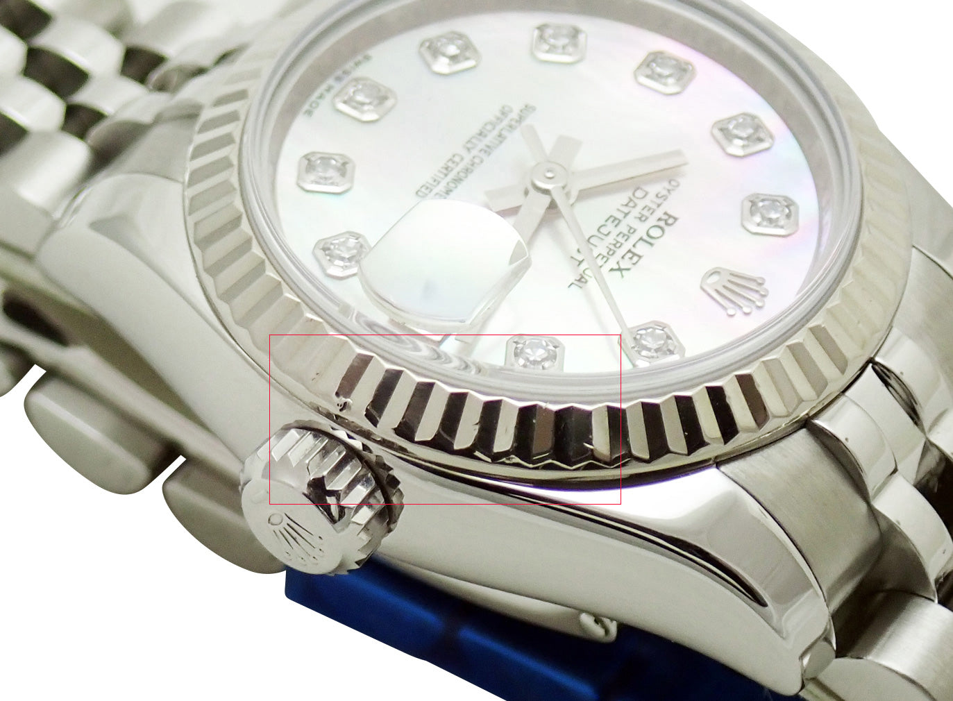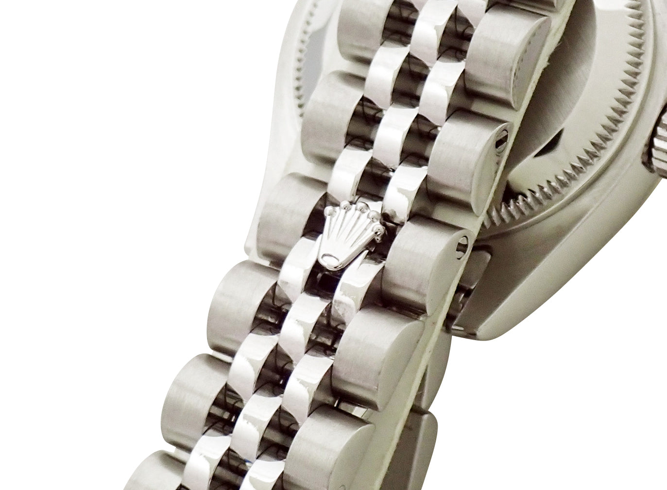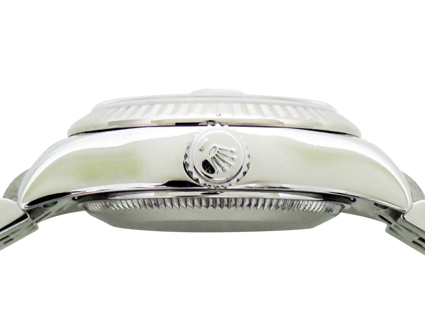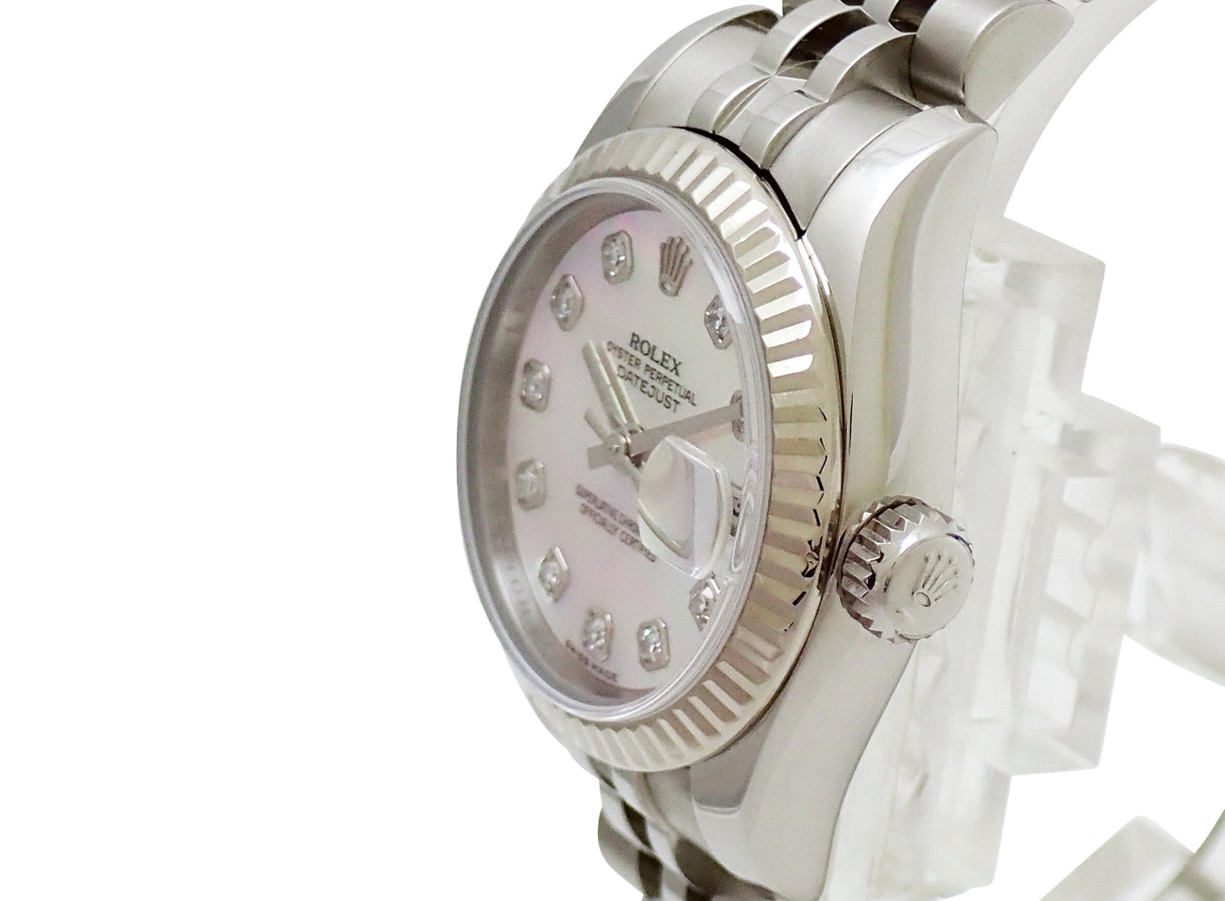 ロレックスを代表するデイトジャストは飽きのこないデザインの為、スーツ、カジュアル、シーンを問わずお使いいただける万能アイテムです。WGベゼルがラグジュアリーな演出してくれます。G番・10Pダイヤ シェル文字盤モデル。