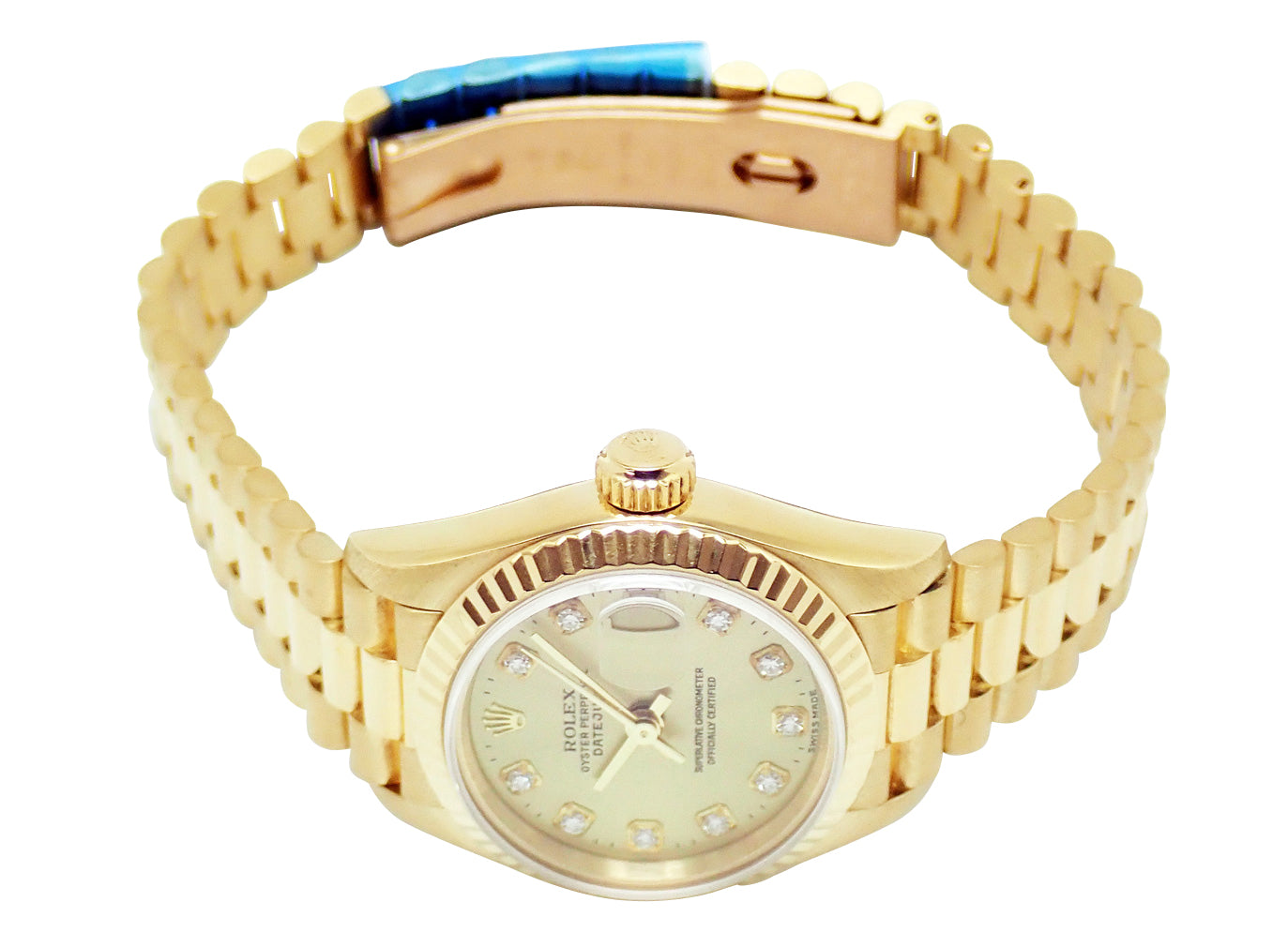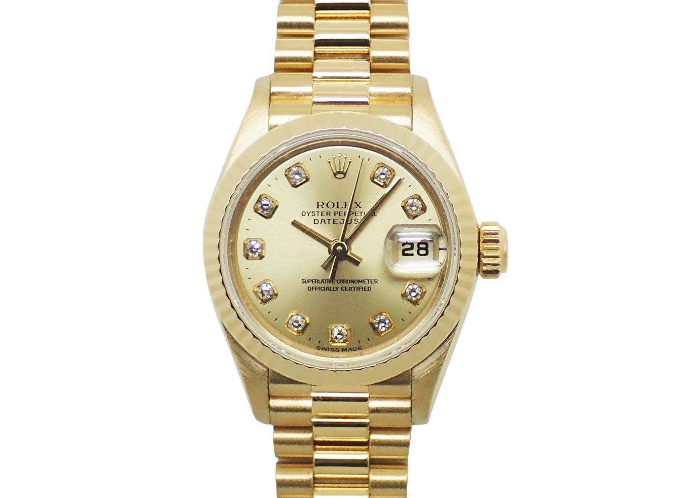 長年使用しても飽きの来ないレディース ロレックスの定番モデル、デイトジャストのK18金無垢モデルです。飽きのこないデザインとハイグレードモデルの金無垢はラグジュアリー感が存分に味わえる1本です。10Pダイヤモデル。