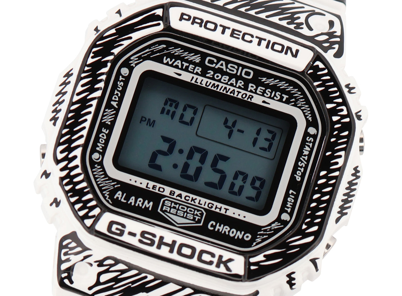 1983年の誕生以来、様々なカルチャーと融合し進化を続けるG-SHOCKから、Joshua Vides(ジョシュア・ヴィーダス)とのコラボレーションモデルです。スクエアフォルムが人気の「DW-5600」に、Joshua Videsならではのモノトーンを基調としたコミックタッチのグラフィックをフェイス部からベゼル、バンドまで時計全体に配しました。ホワイトをベースにブラックのグラフィックと光沢仕上げにより、強いコントラストと存在感を演出します。Joshuaの手描き風フェイスデザインが特徴で、バックライト点灯時には彼のトレードマークの「Cone」が浮かび上がります。特製パッケージ付きのスペシャルモデルです。
