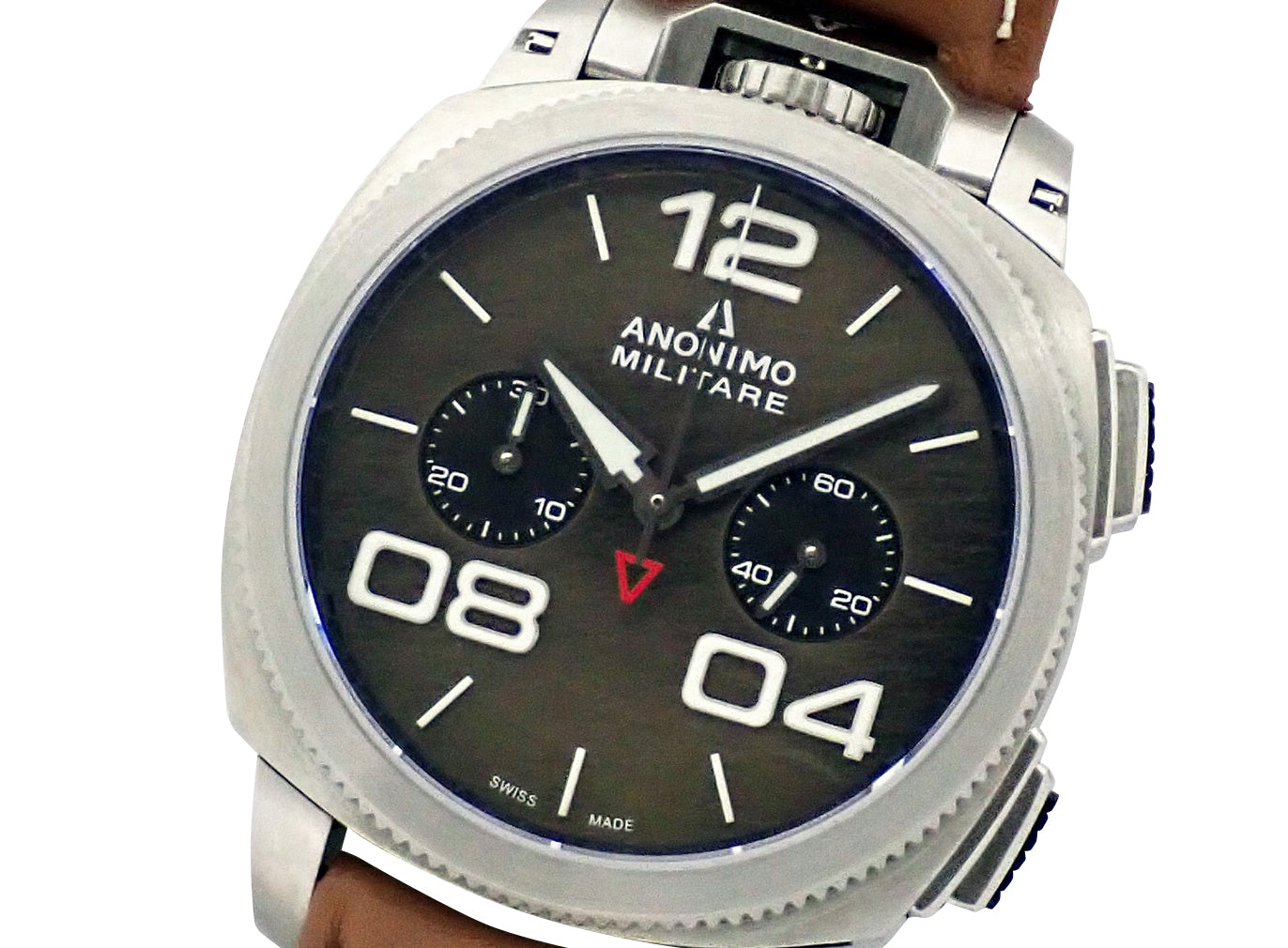クラシックなイタリアン・ミリタリーウォッチ アノーニモ。ミリタリーウォッチの伝統を現代的に解釈した逸品。堅牢なステンレススチールケースに視認性の高いダイアルを備え、クロノグラフ機構を搭載しています。リューズを12時側に配置しタイムレスなデザインと確かな技術力が融合した、コレクターズピースとしての価値を持つ一本です。