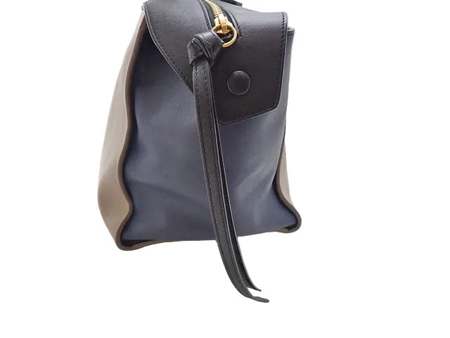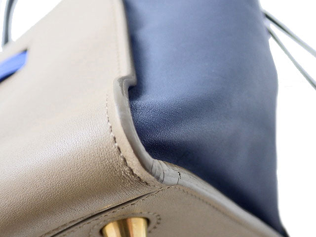 レザー。ブラック/ブルー/モカベージュ。ゴールド金具。30×22×17cm。ハンドル高さ16cm。シリアルU-GA-0145。保存袋付。