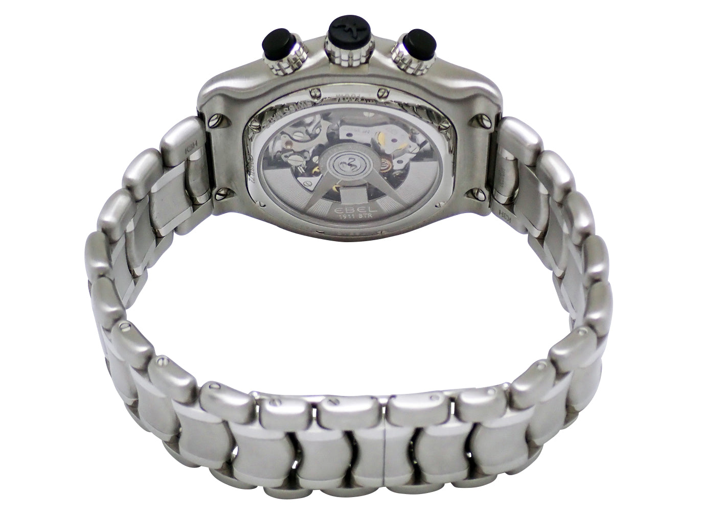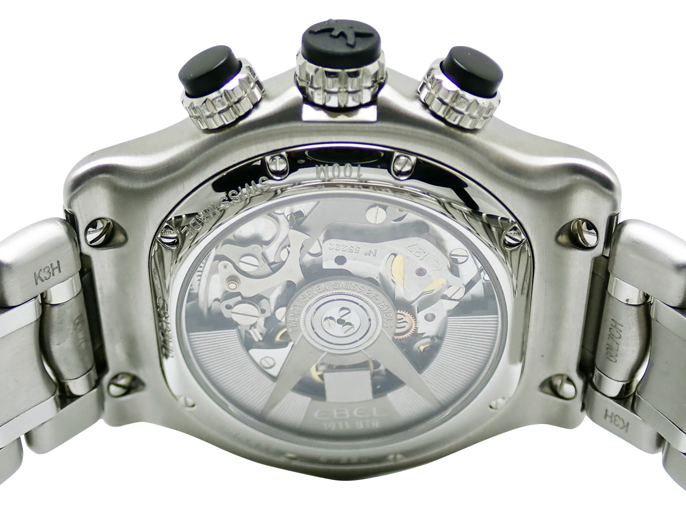 創業は1911年の100年以上の歴史をもつスイスの老舗時計メーカーのエベル。ボーリュームある44.5mmケースにエベル自社ムーブメントCal.137搭載。シースルーバックからキャリバーを確認出来ます。