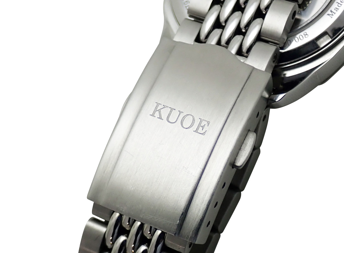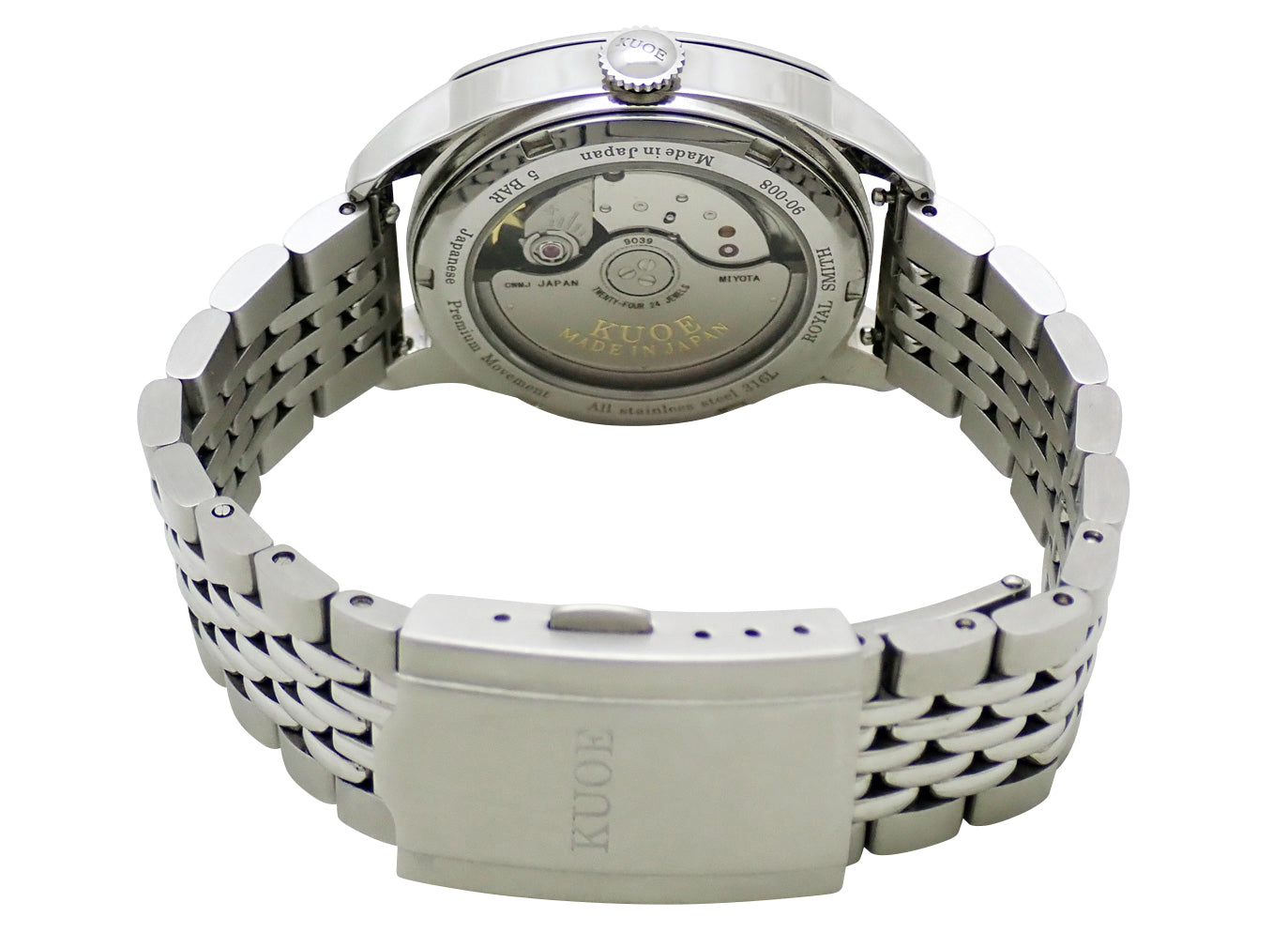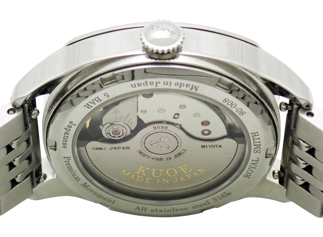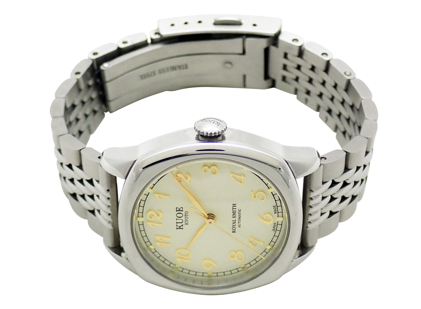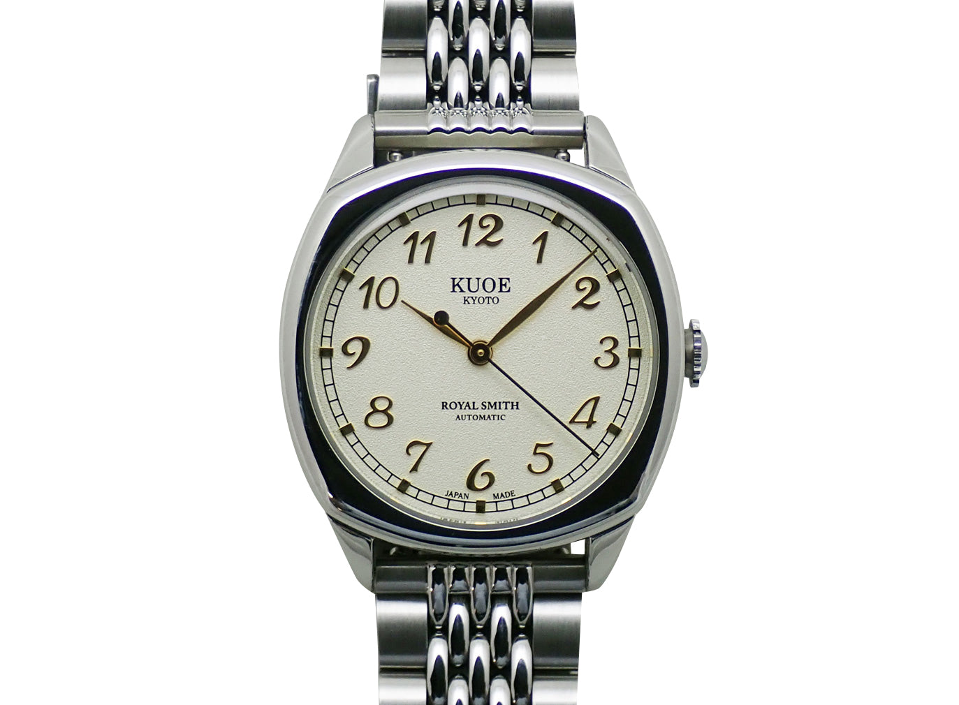 KUOEのプレミアムラインとなるROYAL SMITH。1940'sのアンティークウォッチに着想を得たこのモデルは、当時よく見られたクッションケースを採用。文字盤には古典的なブレゲ数字が1つ1つ人の手で張り付けられています。また、文字盤表面には立体感のある凹凸加工が施されています。Miyota Cal.9039を搭載。