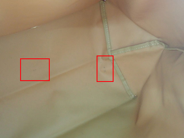 外面、気にならない程度の傷あり。角、スレあり。底面フチまわり、気にならない程度の黒ずみ汚れあり。ゴールドのボタンホック、わずかにコーティング剝がれあり。中、気にならない程度の黒っぽい色移りあり。