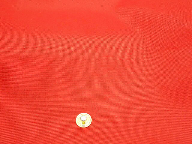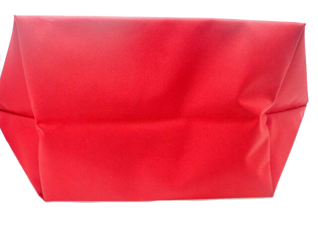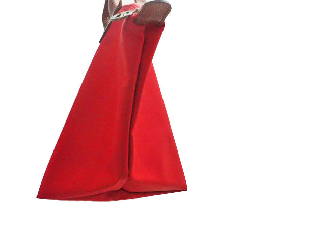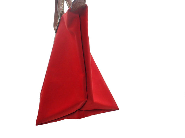再生ポリアミドキャンバス地/内側にコーティング/ロシアンレザー(カウハイド)牛革。レッド。ゴールドのボタン/ダークシルバーのファスナー金具。上部45-下部28.5×27×20.5cm。持ち手の高さ10cm。付属品なし。
