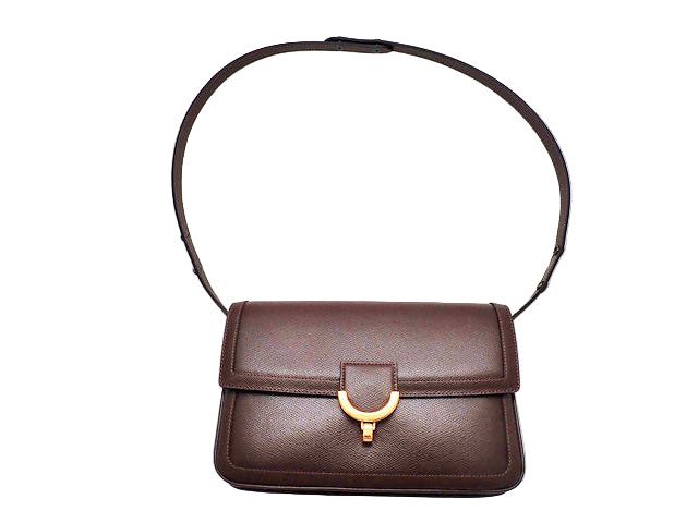 エレガントなブラウンカラーにゴールド金具がアクセントを添えています。コンパクトでありながら収納力があり、ハンドルはボタンホックで斜め掛けサイズに調整可能です。日常から特別な場面まで幅広く活躍する一品です。