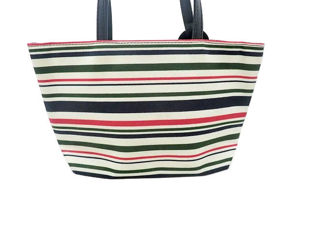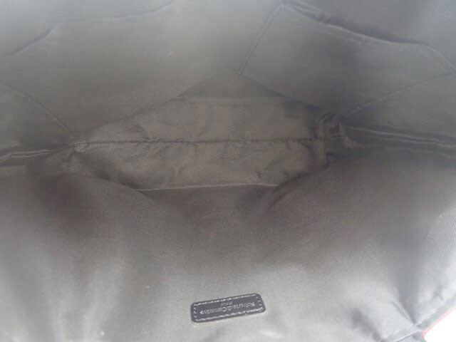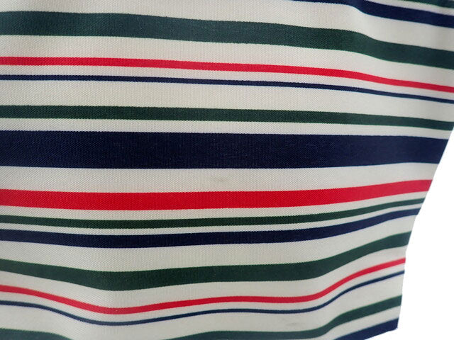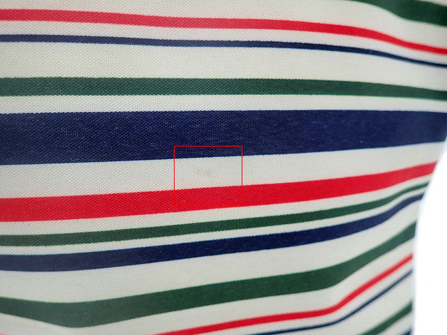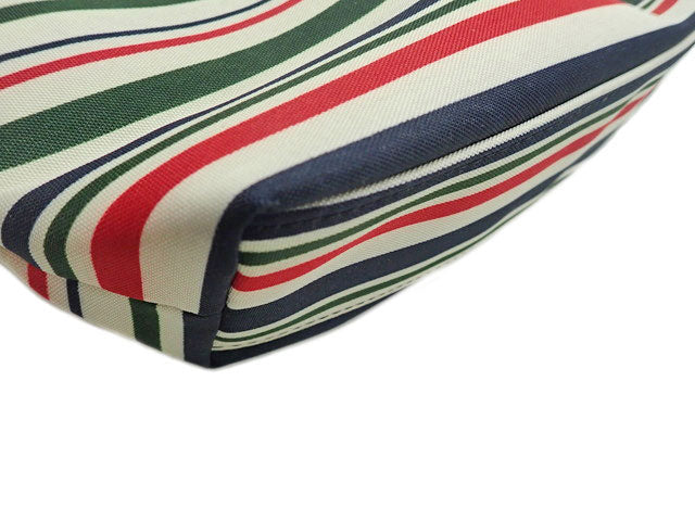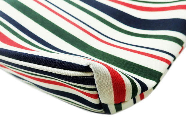 ナイロンキャンバス/レザー。アイボリー/ブラック/グリーン/レッドマルチカラー。上部31-下部21.5×18×8cm。付属品なし。