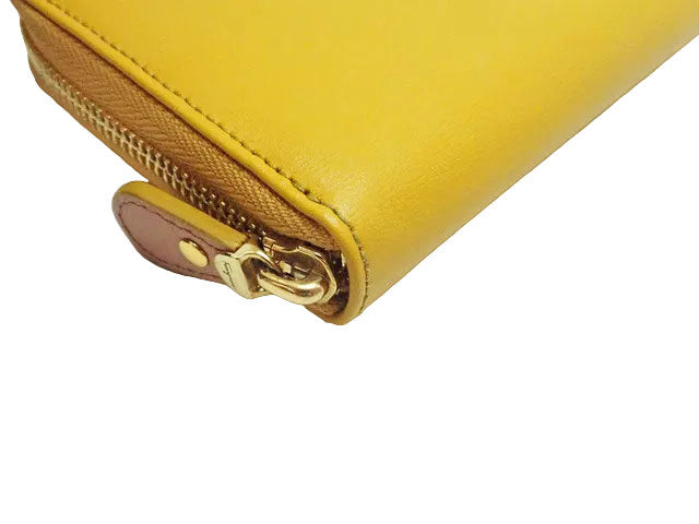 カーフレザー。外面:イエロー/内面:ヌーディーピンク。ゴールド金具。19×10.5×2cm。お取り扱い注意書。箱付。