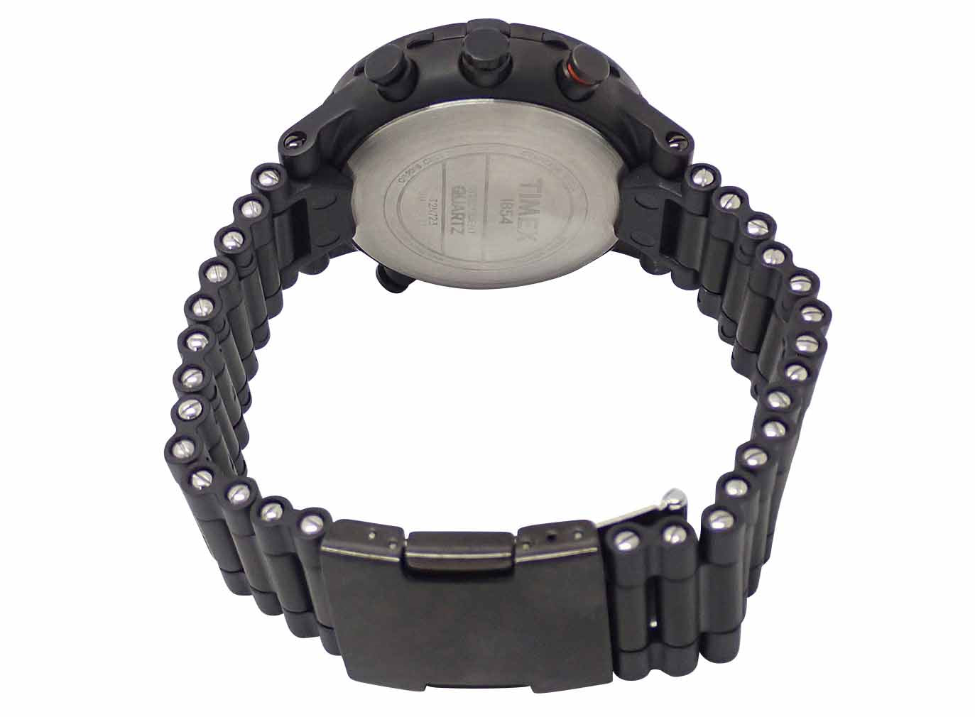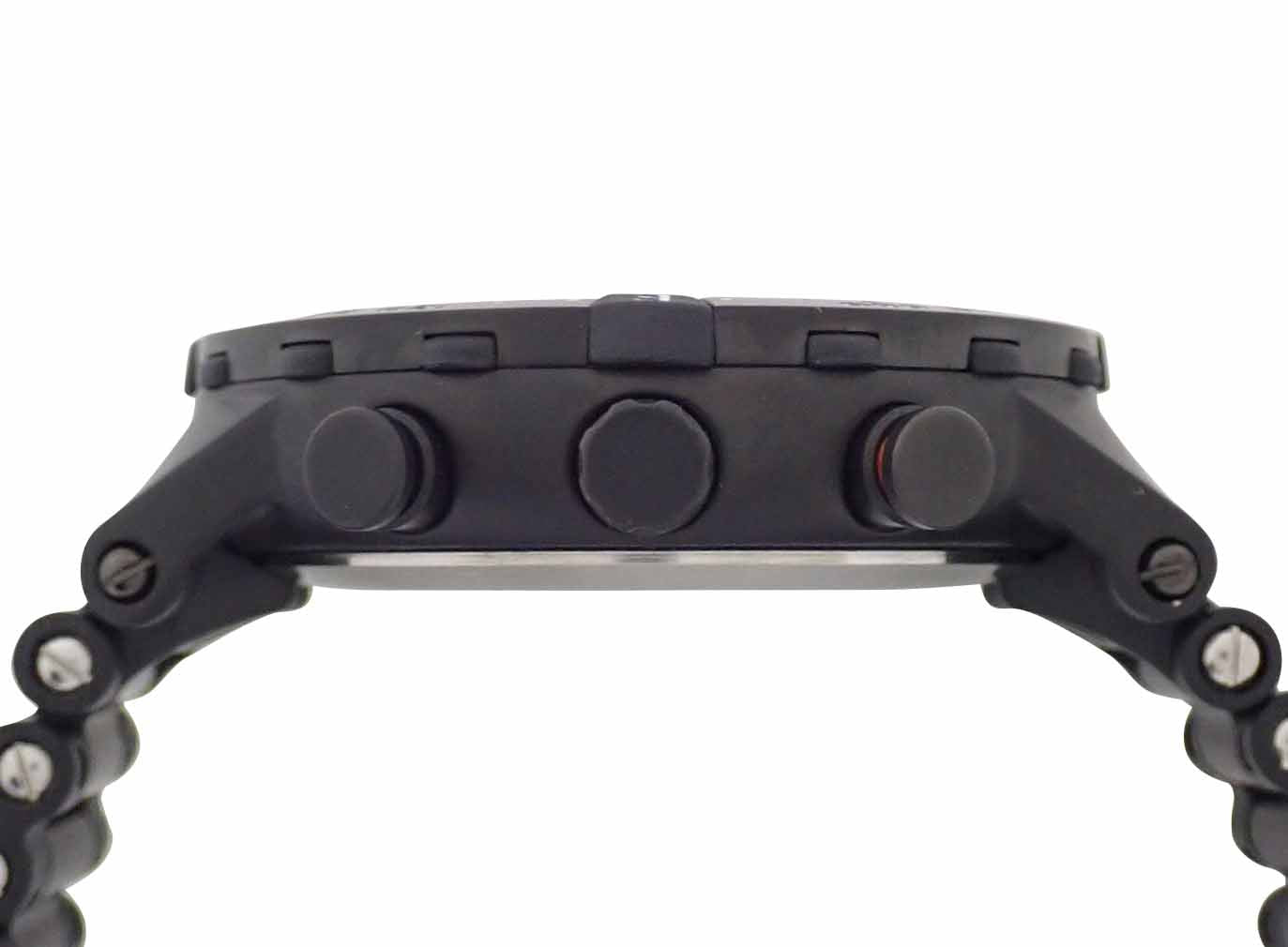 SS。黒文字盤。クォーツ。ケース径45mm・腕周り21cm。箱・説明書(日本語無)付。電池交換済。